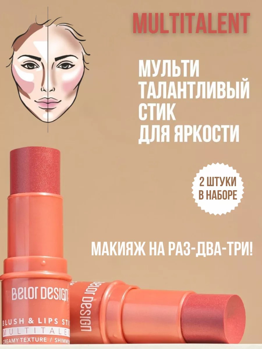MULTITALENT Blush Stick from the Belarusian decorative cosmetics brand Belor Design. This thick stick pencil allows you to quickly give your face a fresh look. The silky, creamy texture spreads evenly and sets quickly on the skin, blending thoroughly for a natural finish. This product format is convenient for applying makeup during a busy day. The blush creates a perfect balance of color on cheeks and lips. Light-reflecting microparticles create the effect of healthy, elastic skin. The stick formula easily adapts to any skin tone and can be applied to bare skin or over foundation. A special mix of softening ingredients protects the skin from drying out and the damaging effects of sun rays. Apply locally to desired areas and blend quickly. Application options: duofiber brush, sponge, or, for a more subtle effect, fingers. The set contains 2 pieces.