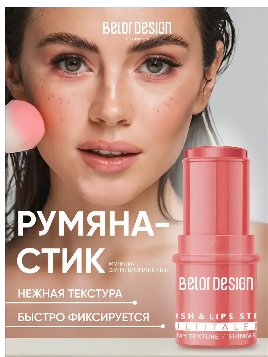 MULTITALENT Blush Stick from the Belarusian brand of decorative cosmetics Belor Design. The thick pencil-like stick allows you to quickly give your face a fresh look. The silky creamy texture spreads evenly and quickly sets on the skin's surface, lending itself to careful blending for the most natural finish. This product format is convenient if you need to apply makeup during a busy day. The blush creates the perfect color balance on cheeks and lips. Light-reflecting microparticles give the effect of healthy, elastic skin. The stick formula easily adapts to any skin type and allows you to apply the product on clean skin or over foundation. A special mix of softening ingredients protects the skin from overdrying and the negative effects of sun rays. Apply locally to the desired areas and quickly blend. Application options: duofiber brush, sponge, or for a more subtle effect - fingers.