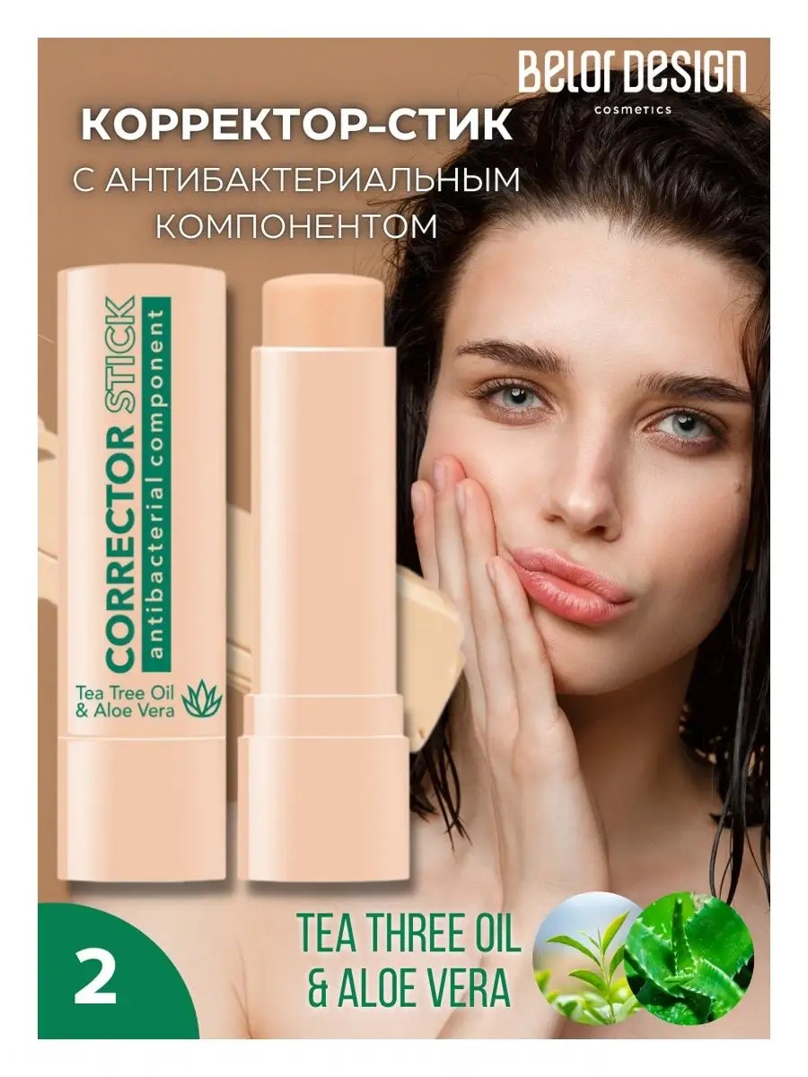 Корректор-стик с антибактериальным компонентом от белорусского бренда декоративной косметки Belor Design (Белор Дизайн. Твой незаменимый помощник в борьбе с маленькими недостатками кожи. Идеально маскирует небольшие дефекты кожи и пигментные пятна, обеспечивает ровное красивое покрытие на весь день. Обладает антибактериальным действием, благодаря входящим в состав корректора активным компонентам: масло чайного дерева и Алоэ вера. Кремовая текстура для легкого нанесения на кожу. Маскирует покраснения и несовершенства кожи. Консилер для лица идеален для проблемной кожи для маскировки морщин, постакне, угрей и высыпаний в виде прыщей. Подходит для всех типов кожи: сухой, жирной, нормальной, комбинированной и чувствительной. Используется как самостоятельно, так и под тональный крем или пудру, а при необходимости для коррекции макияжа в течение дня. Корректор для лица подходит как начинающим пользователям, так и профессиональным визажистам.