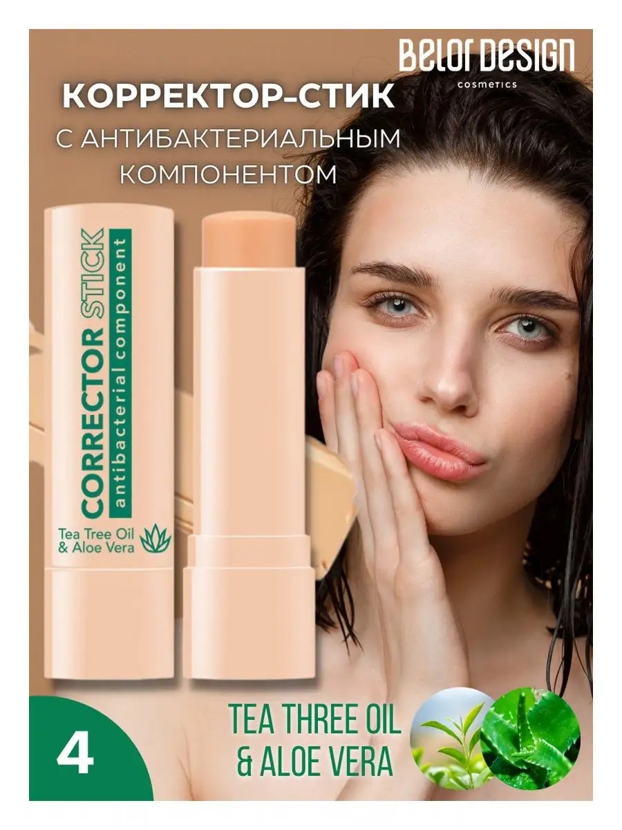 Корректор-стик с антибактериальным компонентом от белорусского бренда декоративной косметки Belor Design (Белор Дизайн. Твой незаменимый помощник в борьбе с маленькими недостатками кожи. Идеально маскирует небольшие дефекты кожи и пигментные пятна, обеспечивает ровное красивое покрытие на весь день. Обладает антибактериальным действием, благодаря входящим в состав корректора активным компонентам: масло чайного дерева и Алоэ вера. Кремовая текстура для легкого нанесения на кожу. Маскирует покраснения и несовершенства кожи. Консилер для лица идеален для проблемной кожи для маскировки морщин, постакне, угрей и высыпаний в виде прыщей. Подходит для всех типов кожи: сухой, жирной, нормальной, комбинированной и чувствительной. Используется как самостоятельно, так и под тональный крем или пудру, а при необходимости для коррекции макияжа в течение дня. Корректор для лица подходит как начинающим пользователям, так и профессиональным визажистам.