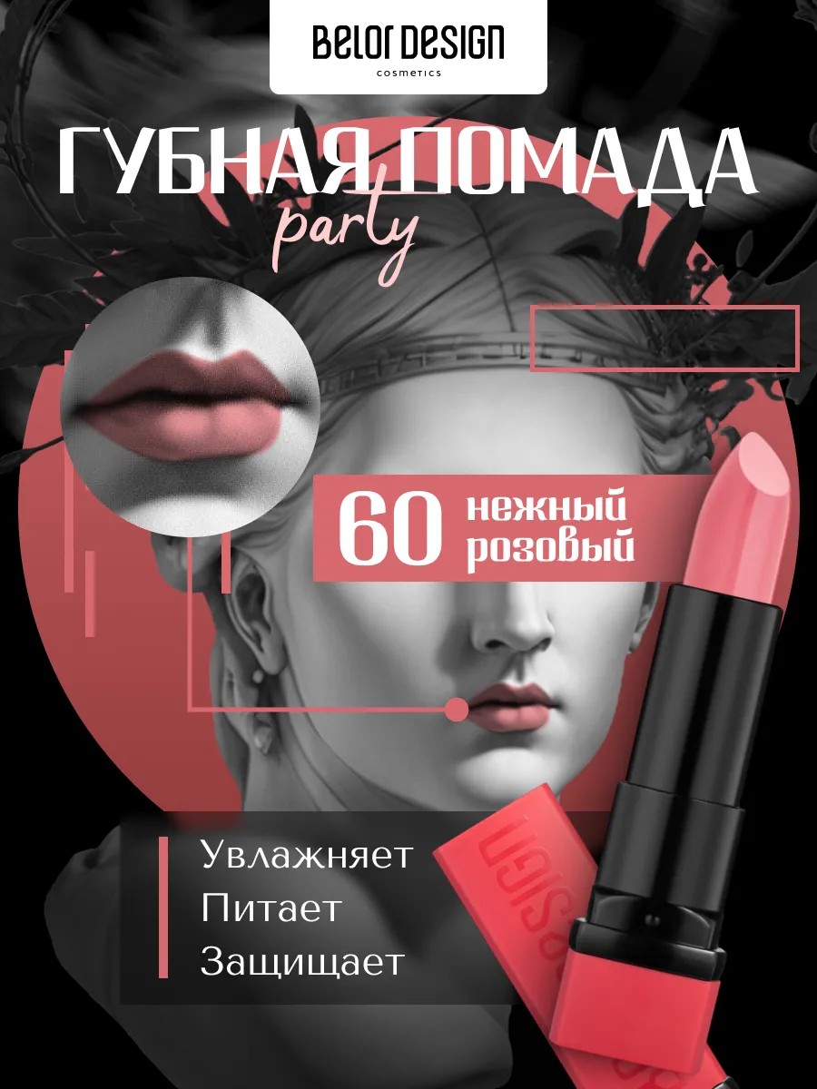Matte moisturizing lipstick "PARTY" in shade 60 "Delicate Pink" from Belor Design has a soft shade and a subtle shine. It does not contain glitter. It emphasizes the lip contour in nude makeup. It can also be used in evening makeup. This women's non-waterproof lipstick from Belarus lasts long, but does not leave an unpleasant film.