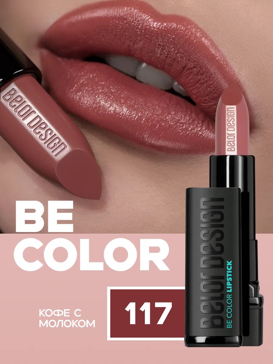 The BE COLOR Moisturizing Lipstick in Coffee with Milk 117 from the Belarusian brand Belor Design perfectly combines care and decorative properties. Its soft, creamy texture glides on smoothly, providing full coverage.