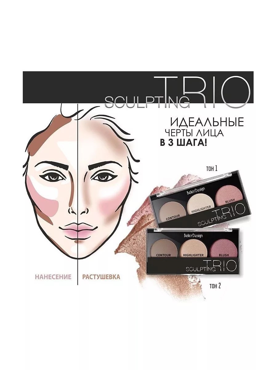 Набор для скульптурирования лица Belor Design "Sculpting Trio", тон 002, контур, хайлайтер, пудра. Палетка для макияжа Trio содержит 3 идеально подобранных оттенка хайлайтера, румян и контуринга, которые подходят для всех цветотипов. Палетка даёт возможность бесконечно экспериментировать, попробовать все техники макияжа, а также - идеально подчёркивать контуры лица, скрывать недостатки и подчеркивать достоинства. Сухая профессиональная текстура позволяет идеально растушевать продукт без всяких усилий. Профессионально подобранные универсальные оттенки и текстуры. Содержит советы по созданию естественного и драматического макияжа. Может использоваться для создания полного образа. Срок годности: 24; Состав: Talc, Mica, Dimethicone, Caprylic, Capric Triglyceride, Ethylhexyl Palmitate, Lauroyl Lysine, Methylparaben, CI 77491, CI 77492, CI 77499, CI 77891, Octyldodecyl Stearoyl Stearate, Boron Nit, Ethylhexyl Palmitate, Stearic Acid, Palmitic Acid, Methylparaben, Dimethicone, CI 75470, CI 77491, CI 77891, Mica, Synthetic Fluorphlogopite, Tin Oxide, Triethoxycaprylylsilane, Silica, Boron Nitride, Tapioca Starch, Dimethicone; Цвет: бежевый;
