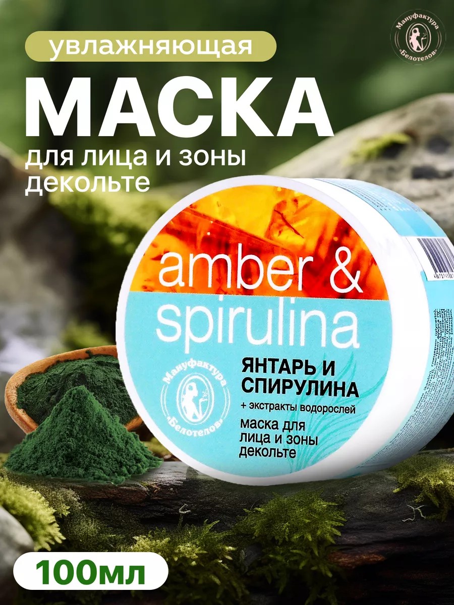 Маска для лица и зоны декольте для сухой и чувствительной кожи. Компоненты маски увлажняют, питают, активизируют выработку коллагена, увеличивают эластичность и упругость кожи. Спирулина - это одна из самых уникальных цианобактерий, которая богата витаминами. Она содержит в 10 раз больше бета-каротина, чем морковь, огромное количество витамина В12,В9,В6 и В2. Также в спирулине содержатся витамины Е (токоферол), С, минеральные вещества и микроэлементы: калий, кальций, магний, цинк, марганец, фосфор, железо, микродозы йода, селен. В спирулине содержатся такие ценные для здоровья кожи человека соединения, как фикоцианин, гамма-линоленовая кислота, хлорофилл, полный набор всех незаменимых аминокислот. Обладая таким богатым составом, спирулина помогает уменьшить мелкие морщины, повышает эластичность и придает румяное сияние коже. Янтарь измельченный содержит янтарную кислоту, что способствует нормализации энергетических процессов на внутриклеточном уровне.