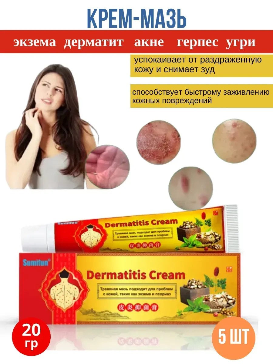 A traditional Chinese miracle ointment. Dermatix cream can be used as a preventative measure against any skin conditions, infections, and even herpes. It is effective against conditions such as psoriasis and eczema, as well as various forms of dermatitis, including allergic, contact, seborrheic, and solar dermatitis. It has a strong antifungal effect. It also combats acne, itching, insect bites, and other inflammations. It eliminates acne, pimples, bruises, and redness. Its main advantage over other ointments is the virtual impossibility of recurrence. Its unique natural composition, free of chemical additives, includes active ingredients such as Amur cork tree, Sophora, and chlorhexidine. Its dense texture absorbs easily and leaves no marks on clothing. The cream is a preventative cosmetic product that can be used in combination to combat the aforementioned conditions.