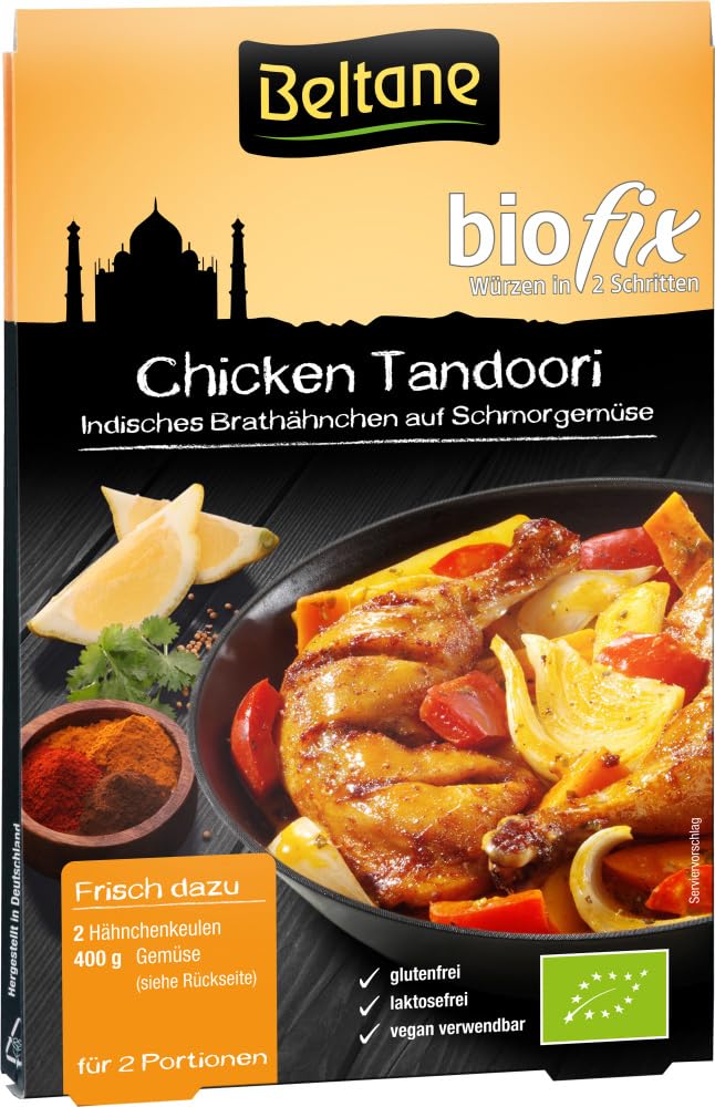 The diversity of Indian cuisine cannot be captured in words. And certainly not in a single jar. Beltane pays homage to Indian culinary culture with four classic poultry preparations: Chicken Tandoori, Chicken Kashmir, Chicken Tikka, and Madras Curry. With Tandoori, you coat the chicken drumsticks in a rich marinade. Fresh vegetables enhance the dish with a delicate blend of peppers, parsley, cilantro, basil, and other precious herbs. The spices are released in the oven and combine to create an exceptional flavor. Healthy, delicious, and easy to prepare with 100 natural ingredients. INSTRUCTIONS Preparation: 1. Peel the chicken drumsticks and make 45 cuts across the grain. Mix the seasoning mix (1 small sachet) with 2 tablespoons of cooking oil and brush onto the chicken drumsticks. Let marinate for a few minutes. 2. Cut the vegetables into large pieces, place them in a greased baking dish, and mix in 2 large sachets with the seasoning mix. Pour in 50 ml of water. 3. Place the chicken drumsticks on top of the vegetables and place in a preheated oven at 200 C (400 F) – top and bottom heat: approximately 60 minutes. Tip: Garnish with lemon slices and onion rings. Pitta bread or rice and a fresh yogurt dip are suitable. SAFETY WARNING Allergy Information: Contains: celery, mustard. Not in production: eggs, fish, milk, nuts, peanuts, sesame, lupin, molluscs. See moreBeltane Biofix Chicken Tandoori Lot de 6 x 21,50 gDESCRIPTION DU PRODUIT DESCRIPTION DU PRODUIT Finition : la diversité de la cuisine indienne ne peut pas être écrite dans des mots. Et surtout pas dans un seul pot. Beltane rend hommage à la culture de la cuisine indienne avec quatre variantes de préparation typiques de volaille : Chicken Tandoori, Chicken Kashmir, Chicken Tikka et Madras Curry. Avec le Tandoori, vous couvrez les pilules de poulet d'une forte marinade. Les légumes frais vous embellissent avec une composition fine de poivrons, persil, coriandre, basilic et d'autres herbes précieuses. Les épices sont ouvertes dans le four et se combinent pour former une unité exceptionnelle. Sain, délicieux et facile à préparer avec des ingrédients 100 naturels. MODE D'EMPLOI Traitement préparation : 1. Épluchez les pilons de poulet et coupez-les 45 fois dans le sens de la fibre. Mélanger le mélange d'assaisonnement 1 petit sachet dans 2 cuillères à soupe d'huile alimentaire et étaler sur les cuisses de poulet avec un pinceau à pâtisserie. Laisser mariner quelques minutes. 2. Coupez les légumes en gros morceaux, mettez-les dans un plat à four graissé et mélangez 2 grands sachets avec le mélange d'assaisonnement. Versez 50 ml d'eau. 3. Placez les pilons de poulet sur les légumes et placez-les dans le four préchauffé à 200 C - Chaleur supérieure et inférieure : environ Cuire au four pendant 60 minutes. Astuce : garnir de tranches de citron et de rondelles d'oignon. Le pain pita ou le riz et une trempette au yaourt fraîche convient. AVERTISSEMENT DE SÉCURITÉ Informations sur les allergies : Contient : céleri, moutarde Pas en production : œufs, poissons, lait, noix, cacahuètes, sésame, lupine, mollusques Voir plus