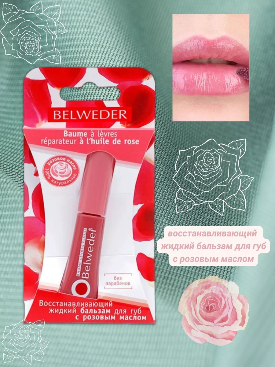 восстанавливающий жидкий бальзам бельведер с аппликатором для губ с розовым маслом имеет богатую, комфортную текстуру, натуральный запах розового масла и пигменты, визуально разглаживающие поверхность губ.