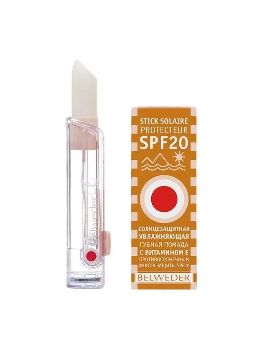 Солнцезащитная увлажняющая губная помада Бельведер с витамином Е (противосолнечный фактор защиты SPF20)Помада Stick solaire protecteur гарантирует быстрый и ощутимый результат от использованияДЕЙСТВИЕ:- С первого применения устраняет сухость, покраснение, шероховатость кожи губ.- Обеспечивает надежную защиту от фотостарения и действия неблагоприятных климатических и экологических условий- Разглаживает, регенерирует и увлажняет кожу губ- Формирует на губах тонкую нежирную защитную пленку- Ускоряет процесс заживления трещинок- Рекомендуется к регулярному применению в весенне-летний период, когда интенсивность солнечного облучения высока, а также все время пребывания в горах и у моря, при занятиях на открытом воздухе- Помада - водостойкаяКЛЮЧЕВЫЕ КОМПОНЕНТЫ:- Фильтры противосолнечные - современные фильтры широкого спектра действия- Воски и масла натуральные: масло из семян хлопка, масло сладкого миндаля, ланолин, воск пчелиный, воск канделильский, воск карнаубский, - смягчают и восстанавливают эластичность кожи- Витамин Е - способствует восстановлению эластичности кожи, защищает клетки от фотостарения