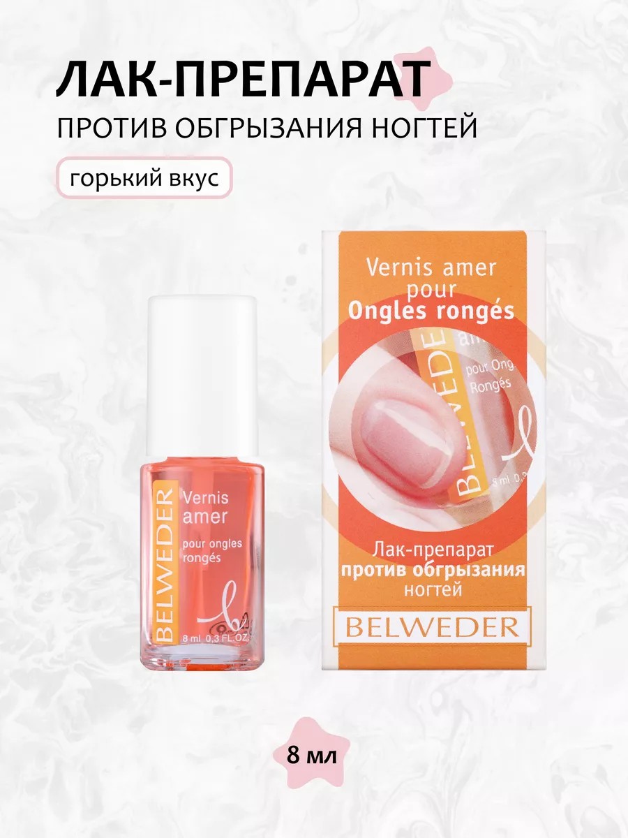 Лак против обгрызания ногтей, прозрачный, 8 мл. Безопасное и эффективное средство с выраженным горьким вкусом предназначен для людей с привычкой грызть ногти и/или держать пальцы во рту. При регулярном использовании препарат помогает справиться с негигиеничной привычкой. Действует с момента нанесения. Неприятный вкус чувствуется не менее 48 часов. Профессиональные товары для красоты и здоровья Belweder (Бельведер) - это гипоаллергенная уходовая косметика для маникюра и педикюра, а также для ухода за ногтями.
