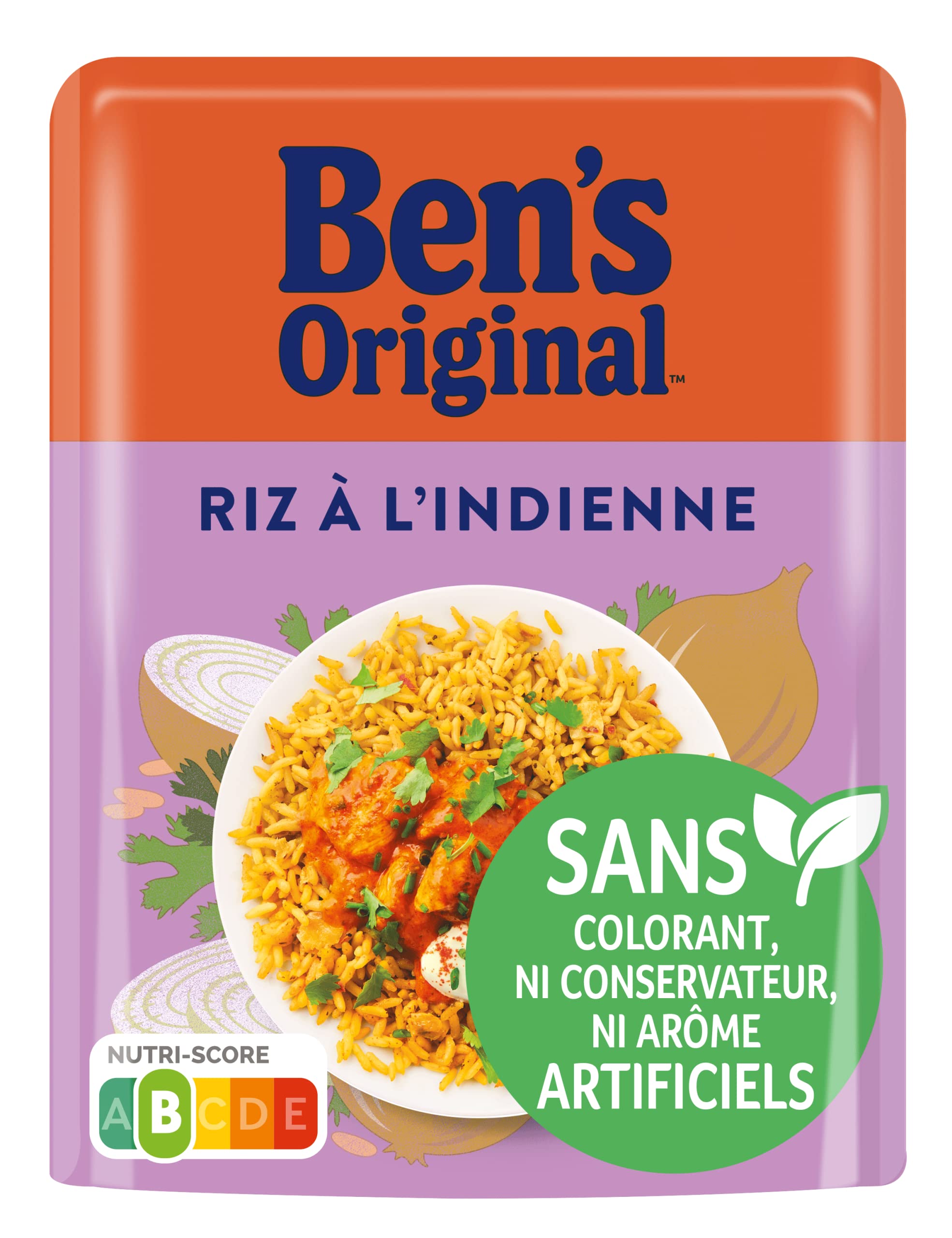 DESCRIPTION DU PRODUIT DESCRIPTION DU PRODUIT BEN'S ORIGINAL Riz Micro Ondable à l'Indienne 2mn 220g Pour votre santé, pratiquez une activité physique régulière. Mars PF France CS 20001 - 45550 St-Denis-de-l'Hôtel N[Cristal : 0 969 390 260 (appel non surtaxé) INGRÉDIENTS Riz long grain précuit à la vapeur (90 ), oignon grillé (3.9 ), huile de tournesol, épices, oignon grillé déshydraté, sucre, poivron rouge, sel, extrait de levure, poudre d'oignon (grillé), ail en poudre, herbes.