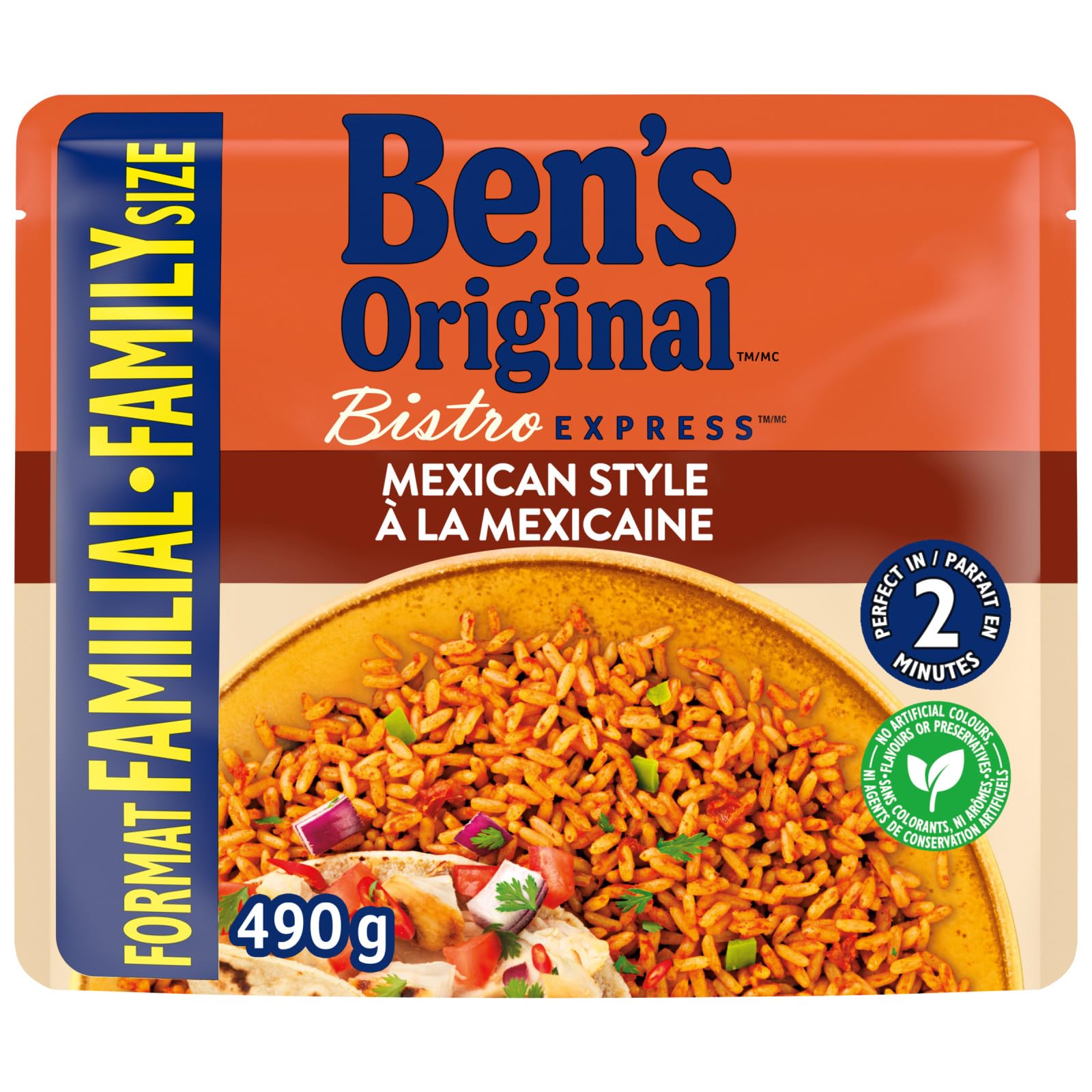 BEN'S ORIGINAL BISTRO EXPRESS Family Size Mexican Style Rice comes in a pouch large enough for the whole family and is the perfect base for family favourite recipes or globally-inspired meals. This microwave rice side dish offers long grain parboiled rice with the savoury flavours of tomatoes, peppers, herbs, and spices to make your meals more flavourful. BEN'S ORIGINAL BISTRO EXPRESS rice comes in a BPA-free microwavable pouch that makes cooking easier by eliminating prep and cleanup. To get this flavoured rice ready to serve, all you have to do is place the pouch in the microwave and cook it for 2 minutes, or pour the contents into a skillet and heat thoroughly. Pair this long grain parboiled rice with your favourite burritos, fajitas or fish tacos, or serve it plain for a quick bite. This Mexican Style flavoured rice contains no artificial colours, flavours, or preservatives. BEN'S ORIGINAL brand is dedicated to creating meals and experiences that offer everyone a seat at the table.Place the pouch in the microwave and cook it for 2 minutes, or pour the contents into a skillet and heat thoroughly. Pair this cooked rice side dish with your favourite protein or serve it plain for a quick bite. Each pouch offers long grain rice the savoury flavours of tomatoes, peppers, herbs, and spices to make your meals more flavourful. Microwave rice pouch that helps you enjoy hassle-free dining with a taste of deliciously seasoned flavoured rice in just 2 minutes.
