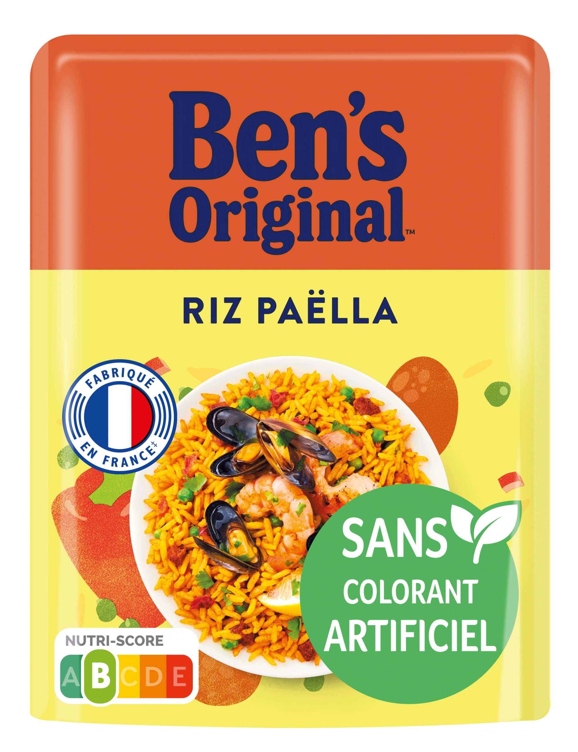 Paëlla Ben's Original cooked rice is a long grain rice slowly pre-cooked by steam and cooked with chorizo, chicken, peas but also red peppers and spices such as saffron. Practical and quick to prepare, the rice is ready in 2 minutes in the microwave or in 3 minutes in the pan. It is made in France. With this cooked rice, without artificial colors, flavors or preservatives, you can create delicious and healthy meals at the same time. Our express rices are available in many varieties of flavors and will diversify your dishes day after day. Nutriscore B - Yuka rating: 45 100 INGREDIENTS Precooked steamed long grain rice (80 ), chorizo (6.0 ) (pork meat, water, potato starch, herbs, spices, pork protein, salt, color (paprika extract), garlic, preservative (sodium nitrite)), red pepper (4.3 ), peas (2.7 ), sunflower oil, double concentrate of tomato puree, salt, spices, barbecue seasoning (onion powder, tomato powder, garlic powder, salt, spices (paprika, red peppers, cumin, pepper, coriander), maltodextrin, modified corn starch, smoke flavor, yeast extract, color (plain caramel), oregano), natural flavor, yeast extract, onion powder, paprika powder, garlic powder, turmeric extract. DIRECTIONS FOR USE Store in a dry place at room temperature. After opening, unheated rice will keep for 3 days in the refrigerator. Packaged in a protective atmosphere. DISCLAIMER Non-contractual photography. The above indications are given for information purposes. They are not necessarily exhaustive and cannot replace the information appearing on the product packaging which alone is authentic, and to which you are invited to refer, particularly in the event of food intolerance. Nutriscore B - Yuka score: 45 100. Origin: Made in France. Suitable for vegetarians. Express microwave rice, ready in 2 minutes. Tasty, foolproof, and quick to prepare. Perfect as a side dish for protein and vegetables. Recipe without artificial colors, preservatives, or flavors. Le riz cuisiné Paëlla Ben's Original est un riz long grain lentement précuit à la vapeur et cuisiné avec du chorizo, du poulet, des petits pois mais aussi des poivrons rouges et des épices comme le safran. Pratique et rapide à préparer, le riz est prêt en 2 minutes au micro-ondes ou en 3 minutes à la poêle. Il est fabriqué en France. Avec ce riz cuisiné, sans colorant, ni arôme, ni conservateur artificiels, vous pouvez créer des repas délicieux et sains à la fois. Nos riz express sont disponibles dans de nombreuses variétés de saveurs et viendront diversifier vos plats jours après jours. Nutriscore B - Note Yuka : 45 100 INGRÉDIENTS Riz long grain précuit à la vapeur (80 ), chorizo (6.0 ) (viande de porc, eau, fécule de pomme de terre, herbes, épices, protéine de porc, sel, colorant (extrait de paprika), ail, conservateur (nitrite de sodium)), poivron rouge (4.3 ), pois (2.7 ), huile de tournesol, double concentré de purée de tomates, sel, épices, assaisonnement barbecue (oignons en poudre, poudre de tomates, ail en poudre, sel, épices (paprika, piments rouges, cumin, poivre, coriandre), maltodextrine, amidon de maïs modifié, arôme de fumé, extrait de levure, colorant (caramel ordinaire), origan), arôme naturel, extrait de levure, oignons en poudre, paprika en poudre, ail en poudre, extrait de curcuma. MODE D'EMPLOI A conserver dans un endroit sec à température ambiante. Après ouverture le riz non-réchauffé se conserve 3 jours au réfrigérateur. Conditionné sous atmosphère protectrice. CLAUSE DE NON-GARANTIE Photographie non contractuelle. Les indications ci-dessus sont données à titre d'information. Elles ne sont pas forcément exhaustives et ne sauraient se substituer aux informations figurant sur l'emballage du produit qui font seules foi, et auxquelles vous êtes invités à vous reporter, notamment en cas d'intolérance alimentaire. Nutriscore B - Note Yuka : 45 100. Origine: fabriqué en France. Convient aux végétariens. Riz express aux micro-ondes, prêt en 2 minutes. Savoureux, inratable et rapide à préparer. Parfait en accompagnement de protéines et de légumes. Recette sans colorant, conservateur ni arôme artificiels.