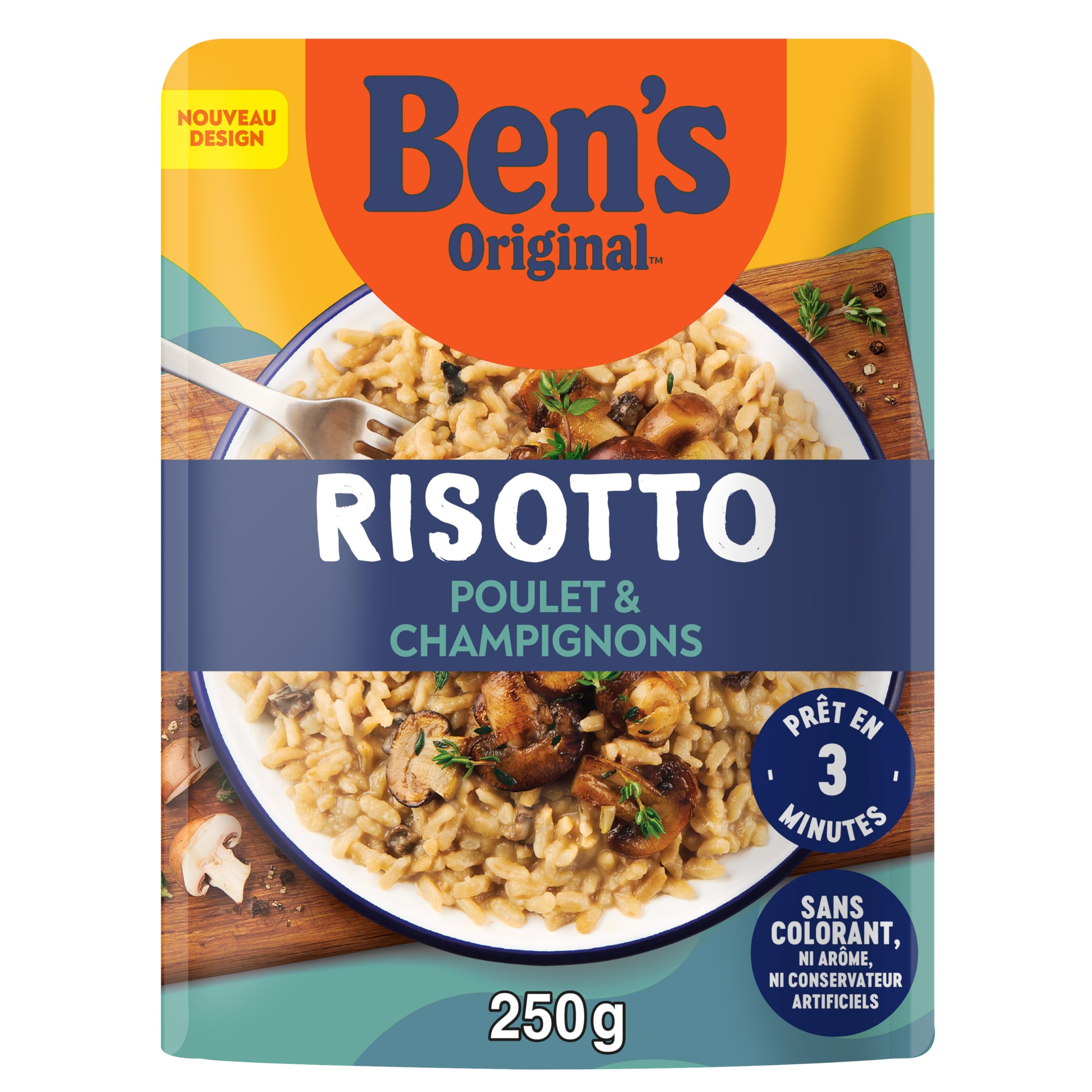 BEN'S ORIGINAL's Chicken and Mushroom Risotto is cooked with Italian loto rice, chicken breast, button mushrooms, thyme and spices for a complete dish ready to eat in just 3 minutes. It is free of artificial colors, preservatives and flavors. Nutriscore C, Yuka Rating: 72 100. INGREDIENTS Ingredients: pre-cooked steamed risotto rice (79 ), mushrooms (button mushrooms) (8.0 ), chicken preparation (5.7 ) (chicken fillet, water, potato starch, salt), sunflower oil, natural flavor, cream (MILK-based), salt, parsley, onion powder, yeast extract, garlic powder, spice, curry powder. DIRECTIONS FOR USE Always a success. In the microwave. Knead the bag to separate the rice grains. Add 100ml of water to the sachet. Heat in the microwave at maximum power for 3 min. (700W) or 2 min. (900W) Mix (Be careful, it's hot!) and let stand for 1 min. Enjoy! In a pan. Mix the bag to separate the rice grains. Pour the contents of the sachet into a pan. Add 100 ml of water or milk and bring to the boil. Leave to simmer for 3 minutes. stirring gently until the risotto is smooth and creamy. Enjoy! PRODUCED IN FRANCE: This recipe comes from the Châteaudun production workshops in the Centre Val de Loire region. EASY OPENING: Guaranteed success with its easy opening, this risotto is a real time saver for healthy and delicious meals. HEALTHY RICE NUTRISCORE C: Made without artificial colors or flavors, in accordance with legislation. This rice contains carefully chosen ingredients. Nutriscore C. Yuka score: 72 100. EXPRESS CHICKEN MUSHROOM RISOTTO READY IN 2 MIN: BEN'S ORIGINAL chicken and mushroom risotto cooked with Italian lotto rice, chicken breast, and button mushrooms is ready in just 2 minutes in the microwave or pan. Le Risotto Poulet et Champignons BEN'S ORIGINAL's est cuisiné avec du riz loto italien, du blanc de poulet, des Champignons de Paris, du thym et des épices pour un plat complet prêt à déguster en 3 minutes seulement. Il est sans colorant, ni conservateur, ni arôme artificiels. Nutriscore C, Note Yuka : 72 100. INGRÉDIENTS Ingredients: riz pour risotto précuit à la vapeur (79 ), champignons (champignons de Paris) (8.0 ), préparation à base de poulet (5.7 ) (filet de poulet, eau, fecules de pomme de terre, sel), huile de tournesol, arðme naturel, crème (a base de LAIT), sel, persil, oignons en poudre, extrait de levure, ail en poudre, épice, curry en poudre. MODE D'EMPLOI Toujours un succès… Au four micro-ondes. Malaxez le sachet pour séparer les grains de riz. Ajoutez 100ml d'eau dans le sachet Réchauffez au four micro-ondes à puissance maximale pendant 3 min. (700W) ou 2 min. (900W) Mélangez (Attention c'est chaud!) et laissez reposer 1 min. Dégustez! Dans une poêle. Malaxez le sachet pour séparer les grains de riz. Versez le contenu du sachet dans une poêle. Ajoutez 100 ml d'eau ou de lait et portez à ébullition. Laissez mijoter pendant 3 min. en remuant délicatement jusqu'à ce que le risotto soit onctueux et crémeux. Dégustez! PRODUIT EN FRANCE : Cette recette est issue des ateliers de production de Châteaudun en région Centre Val de Loire. OUVERTURE FACILE : Succés assuré avec son ouverture facile, ce risotto est un vrai gain de temps pour des repas sains et délicieux. RIZ SAIN NUTRISCORE C : Elaboré sans colorant, ni arôme artificiels, conformément à la législation. Ce riz contient des ingrédients choisis avec soin. Nutriscore C. Note Yuka : 72 100. RISOTTO POULET CHAMPIGNONS EXPRESS PRÊT EN 2 MIN : Le risotto poulet et champignons BEN'S ORIGINAL cuisiné avec du riz loto italien, du blanc de poulet, des Champignons de Paris est prêt en 2 minutes seulement au micro-onde ou à la poêle.