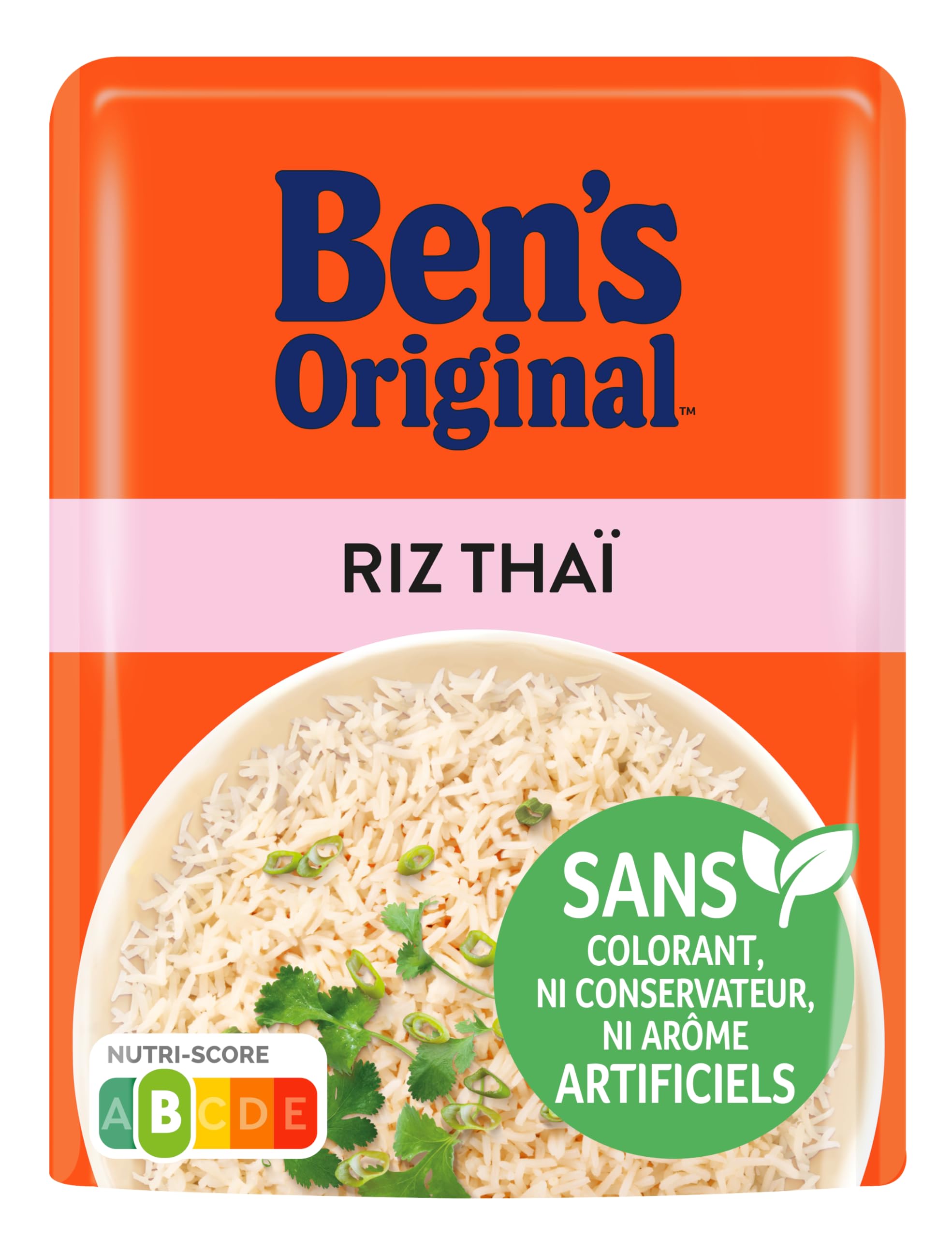 Thai rice is a Hom mali Jasmine rice, sourced directly from Thailand, slowly pre-steamed. Its slightly floral taste is reminiscent of jasmine. Deliciously and naturally fragrant, it pairs well with Asian-inspired dishes. Tasty, foolproof and quick to prepare in 2 minutes, in the microwave or in a pan. It is free from artificial colors, preservatives and flavors. INGREDIENTS Ingredients: pre-steamed jasmine rice (98 ), sunflower oil, emulsifier (SOY lecithin)Suitable for vegetarians. Quick microwave rice. Delicious, foolproof, and quick to prepare in 2 minutes. Featuring Asian-inspired dishes. Recipe without artificial colors, preservatives, or flavors: Nutri-Score B. Le riz Thaï est un riz Jasmin Hom mali, en provenance directe de Thaïlande, lentement précuit à la vapeur. Son goût légèrement fleuri rappelle celui du jasmin. Délicieusement et naturellement parfumé, il se marie avec des plats d'inspirations asiatiques. Savoureux, inratable et rapide à préparer en 2 minutes, au micro-ondes ou à la poêle. Il est sans colorant, ni conservateur, ni arôme artificiels. INGRÉDIENTS Ingrédients: riz jasmin précuit à la vapeur (98 ), huile de tournesol, émulsifiant (lécithine de SOJA)Convient aux végétariens. Riz express aux micro-ondes. Savoureux, inratable et rapide à préparer en 2 minutes. Avec des plats d'inspirations asiatiques. Recette sans colorant, conservateur ni arôme artificiels: nutriscore B.
