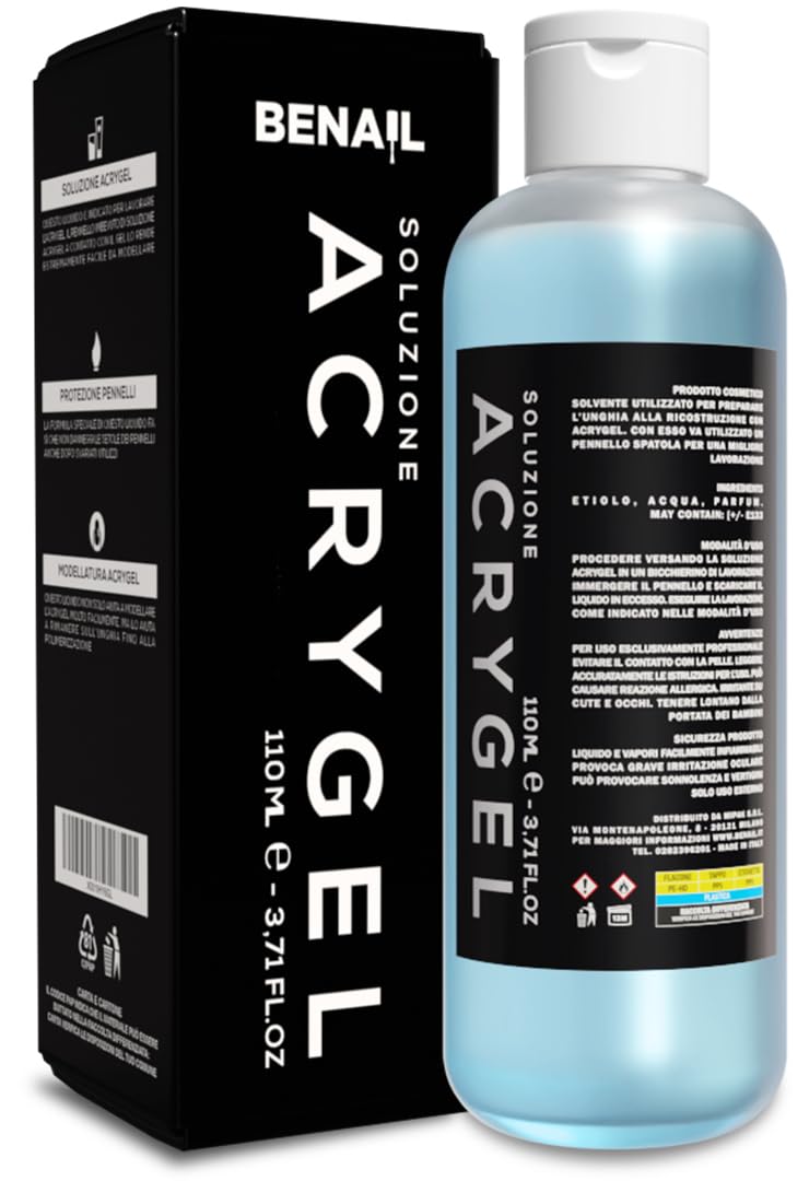 The Acrygel solution comes in a 125ml PET plastic bottle, resistant to sunlight. It is a pink liquid with a pleasant odor. Along with Primer and Base Top Coat preparations, the Acrygel solution is essential for working with Acrygel and Polygel, as it significantly simplifies the application process. The solution aids in the Acrygel preparation by allowing the product to adhere to the nail until polymerization. This innovative Acrygel solution also helps retain nail hairs, improving performance, especially when sculpting nail structures using a Nail Form. Using it is very simple: pour the Acrygel solution into a special glass, dip the spatula brush into it, squeeze out the excess, and begin sculpting the Acrygel. It is recommended to avoid the brush becoming too wet to prevent lifting of the Acrygel or Polygel re-wet the brush whenever it becomes sticky during application. In addition, we have a customer service team of experts available every day to advise and support our customers should they have any questions or concerns about using the product. INSTRUCTIONS FOR USE To use, pour the Acrygel solution into a special glass and dip the spatula brush in it. Drain well and begin shaping the acrygel. It is recommended to avoid the brush becoming too wet to prevent the acrylic or polygel from lifting. Wet the brush whenever it becomes sticky during application. SAFETY WARNING For outdoor use only. See moreBENAIL, TRUSTED PARTNER: Benail is an Italian company with a long history of being a highly trusted brand, constantly seeking solutions to guarantee excellent results for nail care, nail technicians, estheticians, and spas. We have a customer service team of experts available every day to advise and support our clients whenever needed. Is this right for me? The Acrygel solution is used by nail enthusiasts, estheticians, nail technicians, and spa professionals to support the application of Acrygel and or Polygel, ensuring a strong and long-lasting reconstruction for up to 4 weeks without creating unsightly lifting. Easy to use: Pour the Acrygel solution into a special glass and dip the spatula brush in it, drain well, and begin applying the Acrygel. It is recommended to avoid the brush being too wet to prevent lifting of the acrylic or Polygel wet the brush whenever it becomes sticky during application. Acrygel Sculpting: This solution aids in acrylic nail application by allowing the product to remain on the nail until polymerization. It is an innovative acrygel solution that also helps retain nail hair, improving performance, especially when sculpting nail structures using a nail form. Why use it: The Acrygel solution comes in a 110ml PET plastic bottle that is resistant to sunlight. It is a pink liquid with a pleasant odor. Along with Primer and Base Top Coat preparations, the Acrygel solution is essential for Acrygel and Polygel application, as it significantly simplifies the process.Benail Solution Acrygel pour ongles, Polygel, Reconstruction de vernis, Gel à ongles, Acrygel 125 ml. - Hema Free et Tpo Free Made ItalyDESCRIPTION DU PRODUIT DESCRIPTION DU PRODUIT La solution Acrygel se présente dans un flacon en plastique Pet résistant aux rayons du soleil de 125 ml. comme liquide de couleur rose avec odeur assez agréable. Avec les préparateurs Primer et Base Top Coat, la solution Acrygel est certainement essentielle pour le traitement de l'Acrygel et du Polygel car elle facilite essentiellement sa fabrication. La solution aide à la fabrication de l'Acrygel car elle permet au produit de rester sur l'ongle jusqu'à la polymérisation. C'est une solution Acrygel innovante également pour le maintien des poils, en améliorant les performances surtout dans le modelage des structures ongles avec l'utilisation Nail Form. Pour l'utiliser, il est vraiment très simple, il faut verser la solution Acrygel dans un verre spécial et tremper le pinceau spatule, bien égoutter et commencer à modeler l'acrygel. Il est recommandé d'éviter que le pinceau soit trop humide pour éviter les levages de l'acrylique ou du polygel, mouiller le pinceau chaque fois qu'il est collant pendant la fabrication. En outre, nous sommes équipés d'un service client composé d'experts actifs tous les jours prêts à conseiller et à soutenir nos clients en cas de besoin ou de doute sur l'utilisation du produit. MODE D'EMPLOI Pour l'utiliser, verser la solution Acrygel dans un verre spécial et tremper le pinceau spatule, bien égoutter et commencer à modeler l'acrygel. Il est recommandé d'éviter que le pinceau soit trop humide pour éviter les levages de l'acrylique ou du polygel, mouiller le pinceau chaque fois qu'il est collant pendant la fabrication. AVERTISSEMENT DE SÉCURITÉ Usage extérieur uniquement Voir plusBENAIL PARTNER DE FIANCE : Benail est une entreprise italienne depuis toujours marque d'extrême confiance et à la recherche continue de solutions pour garantir d'excellents résultats à appatsion pour le soin des ongles, onycotechniques, esthéticiennes et SPA. Nous sommes équipés d'un service client composé d'experts actifs tous les jours prêts à conseiller et à soutenir nos clients en cas de besoin. Ça va bien pour moi ? La solution Acrygel est utilisée par les passionnés de Nails, esthéticiennes, onycotechniques et SPA pour soutenir le modelage de l'Acrygel et ou Polygel pour garantir une reconstruction résistante et durable jusqu'à 4 semaines sans créer de soulèvements gênants. Facile à utiliser : il faut verser la solution Acrygel dans un verre spécial et tremper le pinceau spatule, bien égoutter et commencer à modeler l'acrygel. Il est recommandé d'éviter que le pinceau soit trop humide pour éviter les levages de l'acrylique ou du polygel, mouiller le pinceau chaque fois qu'il est collant pendant la fabrication. Modelage Acrygel : la solution aide dans le traitement de l'acrylique car elle permet au produit de rester sur l'ongle jusqu'à la polymérisation. Il s'agit d'