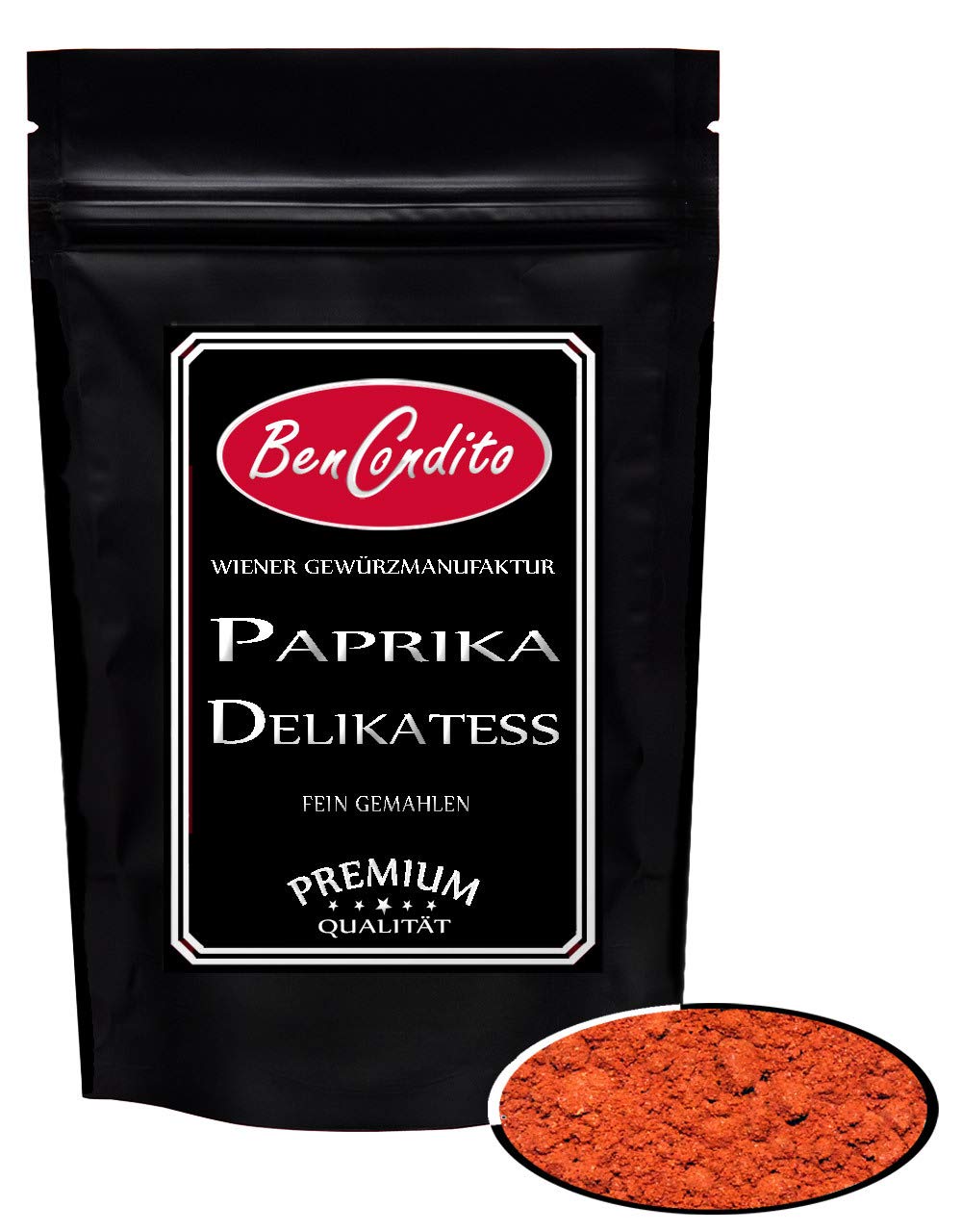 Paprika ""Delikatess"" is made from peppers with thin skin and mild taste, the ripe picked and then dry in the sun or in warm air before they are ground into fine paprika powder. Bencondito's paprika delicacy is delivered in an airtight, food -safe packaging suitable for peppers.So the natural taste and full aroma of the mild paprika powder remain up to the last portion. Our spices are exclusively without flavor enhancers, artificial flavors and color or preservatives. It is very important to us that all our spices and spice mixtures free of lactose and/or.Are gluten and can also be used for vegetarian and vegan cuisine. Paprika Delikatess is also known as: mild paprika powder, Hungarian paprika powder, Hungarian paprika, ground peppers, paprika noble, paprika powder Hungary Ingredients / ingredients Hungarian pepper ground Instructions Ideal for all meat dishes, stews and soups.Also good for egg dishes and cheese. Address manufacturer/importer Bencondito, 1210 Vienna, Austria More taste: mild, aromatic paprika taste. Use: ideal for all meat dishes, stews and soups.Also good for bacon, egg dishes and cheese. consistency: finely ground paprika powder. Net weight: 160 grams. ingredients: Hungarian peppers ground. Paprika ""Delikatess"" wird aus Paprikas mit dünner Haut und mildem Geschmack hergestellt, die reif gepflückt und dann in der Sonne oder bei warmer Luft trocknen, bevor sie zu feinem Paprikapulver gemahlen werden. Der Paprika Delikatess von BenCondito wird in einer für Paprika geeigneten luftdichten, lebensmittelechten Verpackung geliefert. So bleiben natürlicher Geschmack und volles Aroma des milden Paprikapulver bis zur letzten Portion erhalten. Unsere Gewürze sind ausschließlich ohne Geschmacksverstärker, künstliche Aromen und Farb- oder Konservierungsstoffen . Uns ist es sehr wichtig, das Sämtliche unsere Gewürze und Gewürzmischungen frei von Laktose und/od. Gluten sind und auch für vegetarische und vegane Küche verwendbar sind. Paprika Delikatess ist auch bekannt als :mildes Paprikapulver , ungarisches Paprikapulver, ungarischer Paprika, gemahlener Paprika , Paprika edelsüß , paprikapulver ungarn INHALTSSTOFFE / ZUTATEN Ungarischer Paprika gemahlen GEBRAUCHSANWEISUNG Ideal für alle Fleischgerichte , Eintöpfe und Suppen. Auch gut für Eierspeisen und Käse. ANSCHRIFT HERSTELLER/IMPORTEUR BenCondito , 1210 Wien , Österreich MehrGeschmack : Milder, aromatischer Paprikageschmack. Verwendung : Ideal für alle Fleischgerichte , Eintöpfe und Suppen. Auch gut für Speck , Eierspeisen und Käse. Konsistenz : fein gemahlenes Paprikapulver. Netto Gewicht : 160 Gramm. Zutaten : Ungarischer Paprika gemahlen.BenCondito I Paprika Delikatess - fein gemahlenes Ungarisches Paprikapulver 160g Nachfüllung 160.0 Gramm