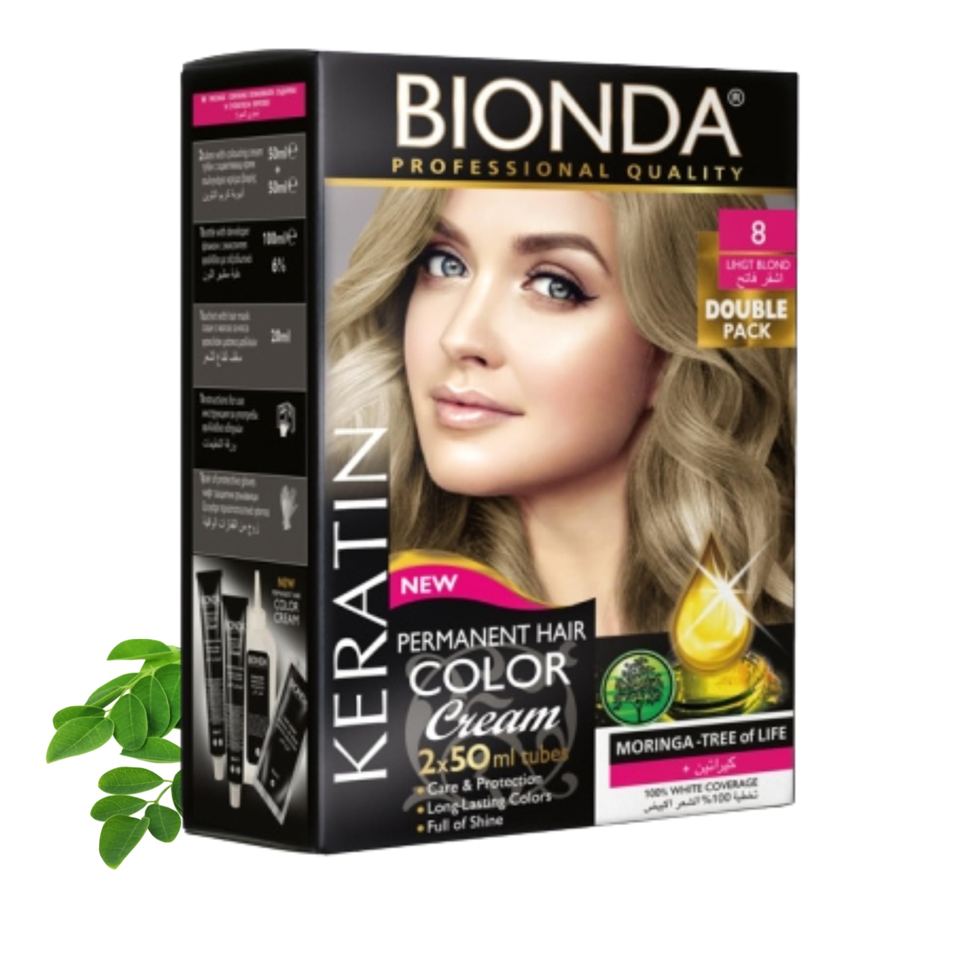 Bionda Professional delivers salon-quality results at home. This 2-pack of permanent cream hair color provides intense, even results and reliable gray coverage, combined with a nourishing formula containing keratin and moringa. Each pack contains everything you need for home use: 2 tubes of color (2 x 50 ml), 1 developer (100 ml, 6 ), 1 conditioning mask (20 ml), gloves, and instructions. Its creamy texture spreads evenly from root to tip for a glossy finish. Benefits and Value – This 2-tube color pack allows you to plan your routine as you wish: a full color application or keep the second tube for root touch-ups. This way, your desired shade remains visible, and you can use the color when it fits into your daily life, offering greater flexibility and value. The formula contains keratin and moringa. The formula promotes a soft, manageable hair feel and visible shine. Keratin smooths the hair surface for a healthy appearance. Moringa completes the conditioning process. The result is permanent hair color with a perfect balance of intensity, shine, and conditioning. Highlights at a glance: Permanent hair color with 100 gray coverage. Even, intense color with a glossy finish. Pack of 2 (2 x 50 ml) for one complete application or subsequent coloring. Includes developer (100 ml, 6 ), a nourishing mask (20 ml), gloves, and instructions (English not guaranteed). Suitable for various hair types, from fine to thick, short to long. Creamy texture for controlled application, ideal for home use. Directions: Perform a patch test as per the instructions 48 hours before each application. Preparation: Wrap your hair in a towel and put on gloves. Mix the color and developer until you obtain a smooth, creamy color. Application: Apply to dry, unwashed hair from roots to ends. Processing time: Leave on according to instructions. Rinse and condition: Rinse thoroughly, then apply the conditioning mask, leave on briefly, rinse, and style. Suitable for anyone looking for reliable, long-lasting hair color with a professional look, whether for a complete color change, to cover gray hair, or to refresh their current shade. The color is suitable for various hair textures (fine, normal, thick) and lengths. Value-added ingredients (no claims of hair healing): Keratin contributes to a smooth, healthy surface and gives hair a well-groomed appearance. Moringa oil is known for its nourishing properties and promotes a soft feel. Together, the color cream combines shine and conditioning. Tips: For best results, choose a shade that matches your initial color if in doubt, choose a lighter shade. Divide your hair into sections and work strand by strand for even results. After coloring, use a color-protecting shampoo and conditioner, and style moderately. For a fresh look, touch up the roots with the second tube. For a complete routine, combine with a color-protecting treatment and regularly use a hair mask – this maintains suppleness and enhances the vibrancy of the color. Safety instructions: Please follow the instructions on the folding box and the package insert. Hair dyes may cause allergic reactions. Not suitable for persons under 16 years of age. Avoid contact with eyes, wear suitable gloves, and carefully follow the instructions for use. Hair Color - Permanent Hair Color - Permanent Cream - Intense Cream - Gray Hair Coverage - 2 x 50 ml - Keratin - Shine Treatment - Hair Coloring - Hair Color - Conditioner Kit - Easy Home Application - Base Color - Base Color - Color Protection - Color Refresh - Hair Color Cream Treatment Instructions (French not guaranteed) INGREDIENTS Aqua, Glycol Stearate, Cetearyl Alcohol, Ammonium Hydroxide, Propylene Glycol, Sodium Laureth Sulfate, Glyceryl Stearate SE, Cetyl Alcohol, Cocamide MEA, Polymeric Alkyl Acrylate, Quaternium Ammonium Acrylamide Hydrolyzed Wheat Protein, Polyquaternium-22, Butyzed Butycle. Rospermum Parkio I Butter, Monoi, Oleifera Seed Oil, Sodium Metabisulfite, p-Phenylenediamine, Ceteareth-25, Resorcinol, 2-Amino-4-Hydroxyethylaminoanisole Sulfate, Tetrasodium EDTA, Pentasodium Pentetate, Erythorbic Acid, Hydrolyzed Keratin, Parfum, Linalool, 4-Amino, 2-Hydroxytoluene. SAFETY WARNING Hair colorants may cause allergic reactions. Perform a skin allergy test 48 hours before each application and follow the instructions. Not suitable for persons under 16 years of age. Avoid contact with eyes. Do not apply to eyelashes or eyebrows. Wear suitable gloves. See moreBrilliant shine and vibrant color: The coordinated formula ensures vivid, intense results with a glossy finish. Ideal for anyone looking for permanent hair color with a professional look and reliable coverage. Added value with a 2-pack: Two tubes of color offer flexibility – color your hair completely today and keep the second tube for a later touch-up. Save time and maintain your desired shade. Easy to use: Creamy texture for precise, drip-free application. Distributes evenly and is suitable for various hair types, from fine to thick, as well as natural or gray hair. Complete kit: 2 tubes of color, 1 x 100ml developer (6 ), 1 x 20ml conditioning mask, gloves, and instructions (English not guaranteed). Mix, apply, leave on, and rinse for reliable results in the comfort of your own home. Keratin and moringa conditioning: Keratin smooths the hair surface, while moringa promotes a soft feel. This creates a visibly brilliant and nourishing color from root to tip. Intense color and coverage: permanent cream hair color with a rich, even shade and up to 100 gray coverage. Pack of 2 x 50 ml – for a full color application or a quick root touch-up at home.Bionda Lot de 2 colorations professionnelles permanentes pour cheveux, 200 ml, soin à la kératine et au moringa, couleur longue durée et brillance, couverture 100 des cheveux gris (8 blond clairDESCRIPTION DU PRODUIT DESCRIPTION DU PRODUIT Bionda Professional est synonyme de résultats matures en salon à la maison. Cette coloration crème permanente en lot de 2 off