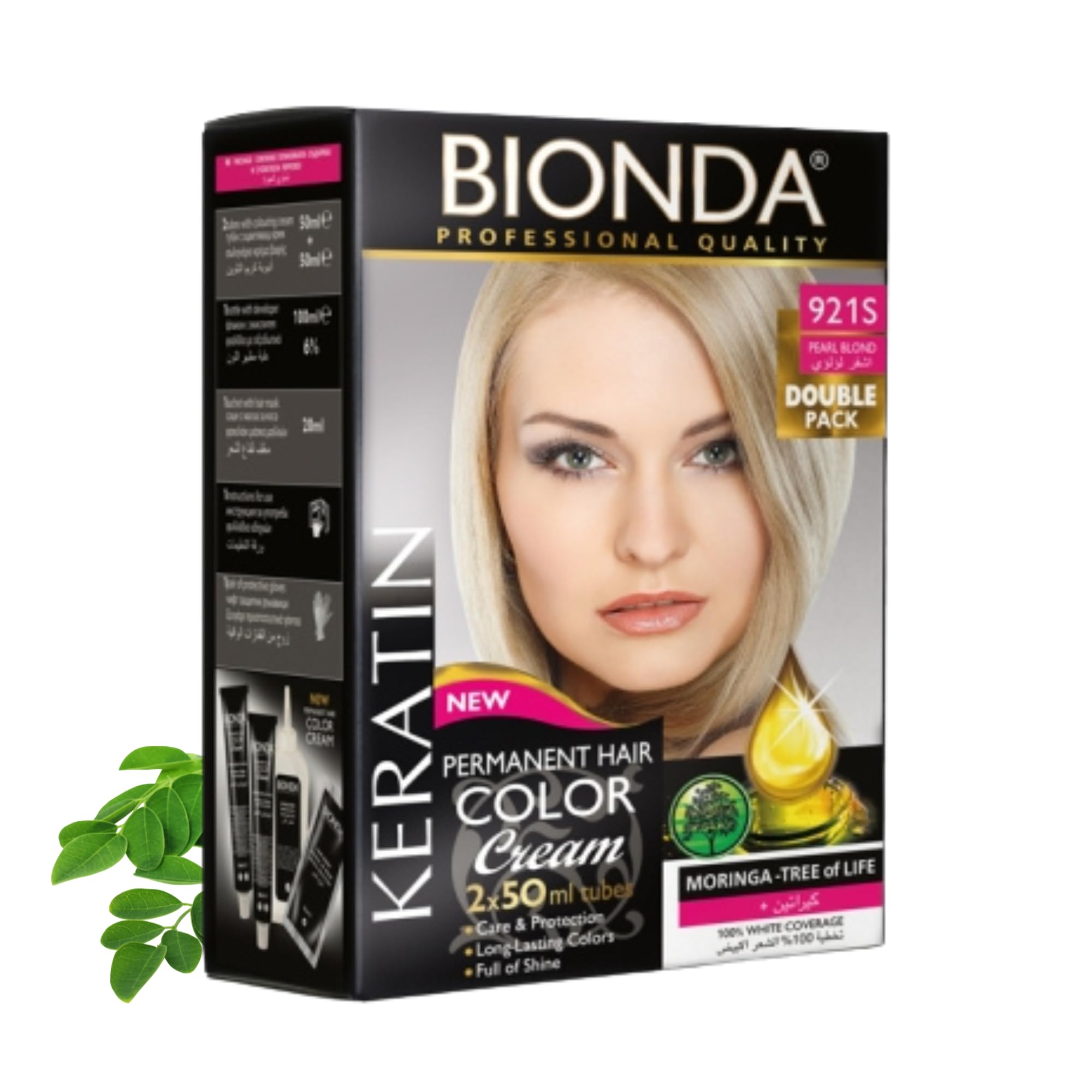 Bionda Professional delivers salon-quality results at home. This 2-pack of permanent cream hair color provides intense, even results and reliable gray coverage, combined with a nourishing formula containing keratin and moringa. Each pack contains everything you need for home use: 2 tubes of color (2 x 50 ml), 1 developer (100 ml, 6 ), 1 conditioning mask (20 ml), gloves, and instructions. Its creamy texture spreads evenly from root to tip for a glossy finish. Benefits and Value – This 2-tube color pack allows you to plan your routine as you wish: a full color application or keep the second tube for root touch-ups. This way, your desired shade remains visible, and you can use the color when it fits into your daily life, offering greater flexibility and value. The formula contains keratin and moringa. The formula promotes a soft, manageable hair feel and visible shine. Keratin smooths the hair surface for a healthy appearance. Moringa completes the conditioning process. The result is permanent hair color with a perfect balance of intensity, shine, and conditioning. Highlights at a glance: Permanent hair color with 100 gray coverage. Even, intense color with a glossy finish. Pack of 2 (2 x 50 ml) for one complete application or subsequent coloring. Includes developer (100 ml, 6 ), a nourishing mask (20 ml), gloves, and instructions (English not guaranteed). Suitable for various hair types, from fine to thick, short to long. Creamy texture for controlled application, ideal for home use. Directions: Perform a patch test as per the instructions 48 hours before each application. Preparation: Wrap your hair in a towel and put on gloves. Mix the color and developer until you obtain a smooth, creamy color. Application: Apply to dry, unwashed hair from roots to ends. Processing time: Leave on according to instructions. Rinse and condition: Rinse thoroughly, then apply the conditioning mask, leave on briefly, rinse, and style. Suitable for anyone looking for reliable, long-lasting hair color with a professional look, whether for a complete color change, to cover gray hair, or to refresh their current shade. The color is suitable for various hair textures (fine, normal, thick) and lengths. Value-added ingredients (no claims of hair healing): Keratin contributes to a smooth, healthy surface and gives hair a well-groomed appearance. Moringa oil is known for its nourishing properties and promotes a soft feel. Together, the color cream combines shine and conditioning. Tips: For best results, choose a shade that matches your initial color if in doubt, choose a lighter shade. Divide your hair into sections and work strand by strand for even results. After coloring, use a color-protecting shampoo and conditioner, and style moderately. For a fresh look, touch up the roots with the second tube. For a complete routine, combine with a color-protecting treatment and regularly use a hair mask – this maintains suppleness and enhances the vibrancy of the color. Safety instructions: Please follow the instructions on the folding box and the package insert. Hair dyes may cause allergic reactions. Not suitable for persons under 16 years of age. Avoid contact with eyes, wear suitable gloves, and carefully follow the instructions for use. Hair Color - Permanent Hair Color - Permanent Cream - Intense Cream - Gray Hair Coverage - 2 x 50 ml - Keratin - Shine Treatment - Hair Coloring - Hair Color - Conditioner Kit - Easy Home Application - Base Color - Base Color - Color Protection - Color Refresh - Hair Color Cream Treatment Instructions (French not guaranteed) INGREDIENTS Aqua, Glycol Stearate, Cetearyl Alcohol, Ammonium Hydroxide, Propylene Glycol, Sodium Laureth Sulfate, Glyceryl Stearate SE, Cetyl Alcohol, Cocamide MEA, Polymeric Alkyl Acrylate, Quaternium Ammonium Acrylamide Hydrolyzed Wheat Protein, Polyquaternium-22, Butyzed Butycle. Rospermum Parkio I Butter, Monoi, Oleifera Seed Oil, Sodium Metabisulfite, p-Phenylenediamine, Ceteareth-25, Resorcinol, 2-Amino-4-Hydroxyethylaminoanisole Sulfate, Tetrasodium EDTA, Pentasodium Pentetate, Erythorbic Acid, Hydrolyzed Keratin, Parfum, Linalool, 4-Amino, 2-Hydroxytoluene. SAFETY WARNING Hair colorants may cause allergic reactions. Perform a skin allergy test 48 hours before each application and follow the instructions. Not suitable for persons under 16 years of age. Avoid contact with eyes. Do not apply to eyelashes or eyebrows. Wear suitable gloves. See moreBrilliant shine and vibrant color: The coordinated formula ensures vivid, intense results with a glossy finish. Ideal for anyone looking for permanent hair color with a professional look and reliable coverage. Added value with a 2-pack: Two tubes of color offer flexibility – color your hair completely today and keep the second tube for a later touch-up. Save time and maintain your desired shade. Easy to use: Creamy texture for precise, drip-free application. Distributes evenly and is suitable for various hair types, from fine to thick, as well as natural or gray hair. Complete kit: 2 tubes of color, 1 x 100ml developer (6 ), 1 x 20ml conditioning mask, gloves, and instructions (English not guaranteed). Mix, apply, leave on, and rinse for reliable results in the comfort of your own home. Keratin and moringa conditioning: Keratin smooths the hair surface, while moringa promotes a soft feel. This creates a visibly brilliant and nourishing color from root to tip. Intense color and coverage: permanent cream hair color with a rich, even shade and up to 100 gray coverage. Pack of 2 x 50 ml – for a full color application or a quick root touch-up at home.Bionda Lot de 2 colorations professionnelles permanentes pour cheveux, 200 ml, soin à la kératine et au moringa, longue durée et couleur avec brillance, couverture 100 des cheveux gris (blond nacré 921S blond perlé 271 g (1er Pack)DESCRIPTION DU PRODUIT DESCRIPTION DU PRODUIT Bionda Professional est synonyme de résultats matures en salon à la maison. Cette color