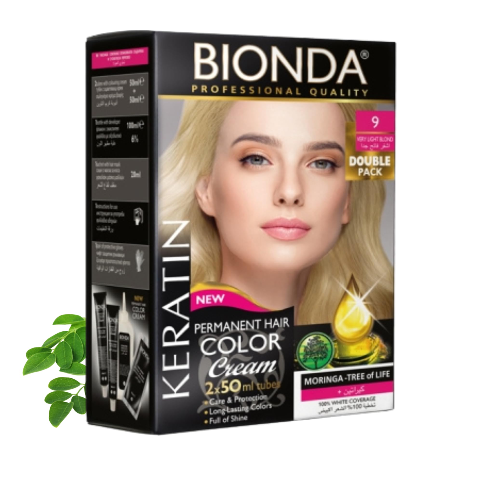 Bionda Professional delivers salon-quality results at home. This 2-pack of permanent cream hair color provides intense, even results and reliable gray coverage, combined with a nourishing formula containing keratin and moringa. Each pack contains everything you need for home use: 2 tubes of color (2 x 50 ml), 1 developer (100 ml, 6 ), 1 conditioning mask (20 ml), gloves, and instructions. Its creamy texture spreads evenly from root to tip for a glossy finish. Benefits and Value – This 2-tube color pack allows you to plan your routine as you wish: a full color application or keep the second tube for root touch-ups. This way, your desired shade remains visible, and you can use the color when it fits into your daily life, offering greater flexibility and value. The formula contains keratin and moringa. The formula promotes a soft, manageable hair feel and visible shine. Keratin smooths the hair surface for a healthy appearance. Moringa completes the conditioning process. The result is permanent hair color with a perfect balance of intensity, shine, and conditioning. Highlights at a glance: Permanent hair color with 100 gray coverage. Even, intense color with a glossy finish. Pack of 2 (2 x 50 ml) for one complete application or subsequent coloring. Includes developer (100 ml, 6 ), a nourishing mask (20 ml), gloves, and instructions (English not guaranteed). Suitable for various hair types, from fine to thick, short to long. Creamy texture for controlled application, ideal for home use. Directions: Perform a patch test as per the instructions 48 hours before each application. Preparation: Wrap your hair in a towel and put on gloves. Mix the color and developer until you obtain a smooth, creamy color. Application: Apply to dry, unwashed hair from roots to ends. Processing time: Leave on according to instructions. Rinse and condition: Rinse thoroughly, then apply the conditioning mask, leave on briefly, rinse, and style. Suitable for anyone looking for reliable, long-lasting hair color with a professional look, whether for a complete color change, to cover gray hair, or to refresh their current shade. The color is suitable for various hair textures (fine, normal, thick) and lengths. Value-added ingredients (no claims of hair healing): Keratin contributes to a smooth, healthy surface and gives hair a well-groomed appearance. Moringa oil is known for its nourishing properties and promotes a soft feel. Together, the color cream combines shine and conditioning. Tips: For best results, choose a shade that matches your initial color if in doubt, choose a lighter shade. Divide your hair into sections and work strand by strand for even results. After coloring, use a color-protecting shampoo and conditioner, and style moderately. For a fresh look, touch up the roots with the second tube. For a complete routine, combine with a color-protecting treatment and regularly use a hair mask – this maintains suppleness and enhances the vibrancy of the color. Safety instructions: Please follow the instructions on the folding box and the package insert. Hair dyes may cause allergic reactions. Not suitable for persons under 16 years of age. Avoid contact with eyes, wear suitable gloves, and carefully follow the instructions for use. Hair Color - Permanent Hair Color - Permanent Cream - Intense Cream - Gray Hair Coverage - 2 x 50 ml - Keratin - Shine Treatment - Hair Coloring - Hair Color - Conditioner Kit - Easy Home Application - Base Color - Base Color - Color Protection - Color Refresh - Hair Color Cream Treatment Instructions (French not guaranteed) INGREDIENTS Aqua, Glycol Stearate, Cetearyl Alcohol, Ammonium Hydroxide, Propylene Glycol, Sodium Laureth Sulfate, Glyceryl Stearate SE, Cetyl Alcohol, Cocamide MEA, Polymeric Alkyl Acrylate, Quaternium Ammonium Acrylamide Hydrolyzed Wheat Protein, Polyquaternium-22, Butyzed Butycle. Rospermum Parkio I Butter, Monoi, Oleifera Seed Oil, Sodium Metabisulfite, p-Phenylenediamine, Ceteareth-25, Resorcinol, 2-Amino-4-Hydroxyethylaminoanisole Sulfate, Tetrasodium EDTA, Pentasodium Pentetate, Erythorbic Acid, Hydrolyzed Keratin, Parfum, Linalool, 4-Amino, 2-Hydroxytoluene. SAFETY WARNING Hair colorants may cause allergic reactions. Perform a skin allergy test 48 hours before each application and follow the instructions. Not suitable for persons under 16 years of age. Avoid contact with eyes. Do not apply to eyelashes or eyebrows. Wear suitable gloves. See moreBrilliant shine and vibrant color: The coordinated formula ensures vivid, intense results with a glossy finish. Ideal for anyone looking for permanent hair color with a professional look and reliable coverage. Added value with a 2-pack: Two tubes of color offer flexibility – color your hair completely today and keep the second tube for a later touch-up. Save time and maintain your desired shade. Easy to use: Creamy texture for precise, drip-free application. Distributes evenly and is suitable for various hair types, from fine to thick, as well as natural or gray hair. Complete kit: 2 tubes of color, 1 x 100ml developer (6 ), 1 x 20ml conditioning mask, gloves, and instructions (English not guaranteed). Mix, apply, leave on, and rinse for reliable results in the comfort of your own home. Keratin and moringa conditioning: Keratin smooths the hair surface, while moringa promotes a soft feel. This creates a visibly brilliant and nourishing color from root to tip. Intense color and coverage: permanent cream hair color with a rich, even shade and up to 100 gray coverage. Pack of 2 x 50 ml – for a full color application or a quick root touch-up at home.Bionda Lot de 2 colorations professionnelles permanentes pour cheveux, 200 ml, soin à la kératine et au moringa, longue durée et couleur avec brillance, couverture 100 des cheveux gris (9 blond trèsDESCRIPTION DU PRODUIT DESCRIPTION DU PRODUIT Bionda Professional est synonyme de résultats matures en salon à la maison. Cette coloration crème permanente en lot de 