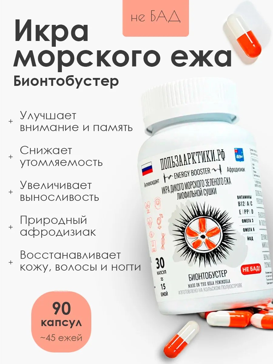 Каждая упаковка содержит эквивалент активных веществ из 30 порций икры диких морских ежей — всего 60 капсул для курсового приема.