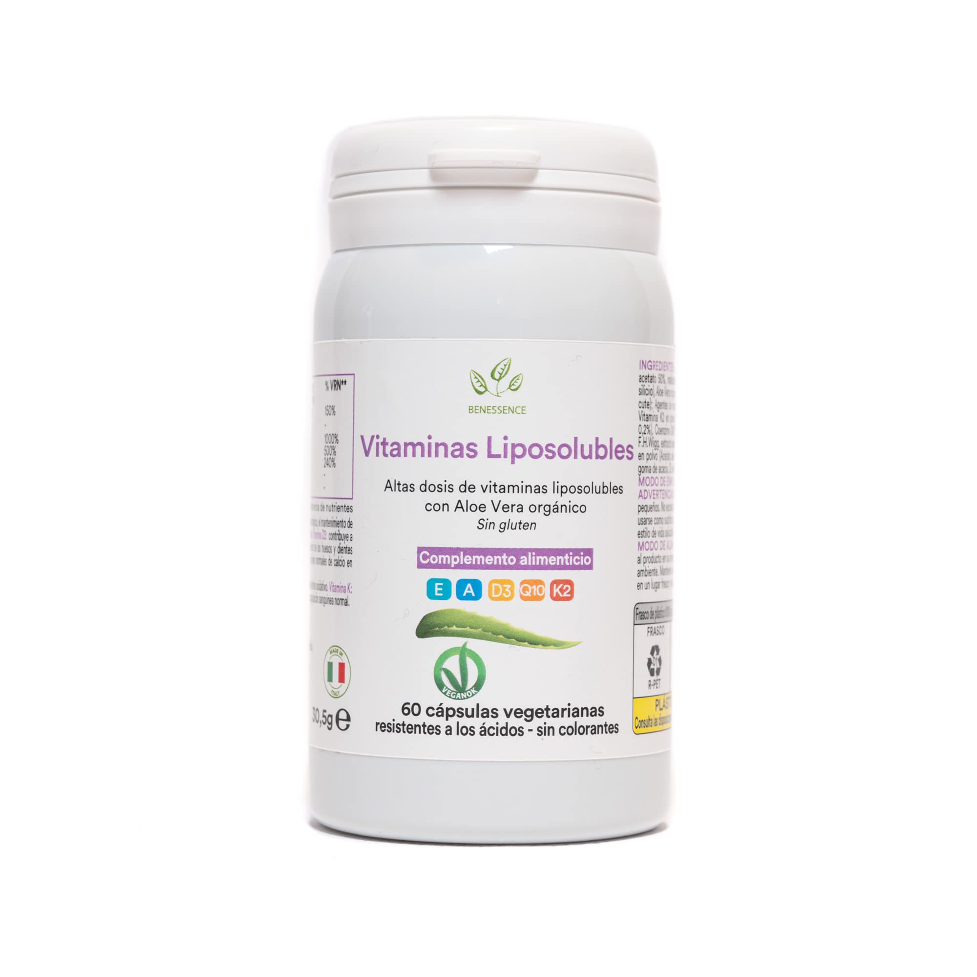 FSSC 22000 (GFSI): Our food supplements strictly comply with FSSC 22000 standards. This important international certification represents an uncompromising commitment to the quality, safety, and traceability of our ingredients and manufacturing process. When you choose our products, you can be sure you're receiving food supplements that meet the highest global standards for food safety and quality. Sustainable Packaging: Our revolutionary packaging combines innovation and sustainability to offer you an eco-friendly solution for your favorite beauty products. The bottle is made from 100 recyclable and recycled materials, helping to reduce environmental impact and preserve our planet's natural resources. THE ONLY ONE THAT CONTAINS ALOE VERA: Emollient and soothing action (digestive system). Body cleansing functions. Vitamin E: Contributes to the protection of cells from oxidative stress. -Vitamin K: Contributes to the maintenance of normal bones and normal blood clotting. Vitamin D3: Contributes to the normal function of the immune system, the maintenance of normal bones and teeth, and normal muscle function. Contributes to normal blood calcium levels and normal absorption of calcium and phosphorus. Vitamin A: Contributes to the normal function of the immune system, the maintenance of normal skin and vision, and normal iron metabolism. Fat-soluble vitamin supplement, coenzyme Q10, and organic aloe vera in vegetarian capsules. HIGH DOSE: 1 capsule provides the maximum daily intake of fat-soluble vitamins (A, D, E, K). Contains coenzyme Q10 with antioxidant action.FSSC 22000 (GFSI) : nos compléments alimentaires sont strictement conformes aux normes FSSC 22000. Cette importante certification internationale constitue un engagement intransisif pour la qualité, la sécurité et la traçabilité de nos ingrédients et du processus de fabrication. Lorsque vous choisissez nos produits, vous pouvez être sûr de recevoir des compléments alimentaires qui respectent les normes mondiales les plus élevées en matière de sécurité alimentaire et de qualité. Emballage durable : notre emballage révolutionnaire combine innovation et durabilité pour vous offrir une solution écologique pour vos produits de beauté préférés. Le flacon est fabriqué à 100 avec des matériaux recyclables et recyclés, ce qui contribue à réduire l'impact environnemental et à préserver les ressources naturelles de notre planète. LE SEUL QUI CONTIENNE DE L'ALOE VERA: action émolliente et apaisante (système digestif). Fonctions de purification du corps. Vitamine E : contribue à la protection des cellules contre le stress oxydatif. -Vitamine K : contribue au maintien d'une ossature normale et à la coagulation normale du sang. Vitamine D3 : contribue au fonctionnement normal du système immunitaire, au maintien d'une ossature et d'une dentition normales et à une fonction musculaire normale. Contribue à un taux de calcium sanguin normal et à une absorption normale du calcium et du phosphore. Vitamine A : contribue au fonctionnement normal du système immunitaire, au maintien d'une peau et d'une vision normales, et au métabolisme normal du fer. Supplément de vitamines liposolubles, de coenzyme Q10 et d'aloès biologique en gélules végétariennes. HAUTE DOSE : 1 gélule fournit la dose journalière maximale de vitamines liposolubles (A, D, E, K). Contient de la coenzyme Q10 à action antioxydante.