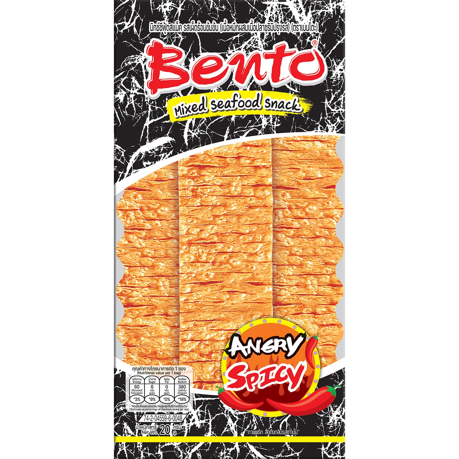 : Discover the delicious taste of Bento Grilled Squid Snacks! They're perfect as a snack on the go, to share with friends, or as a delicious addition to your favorite meals. Savor the powerful and unique taste of Bento Grilled Squid Snacks – the ultimate treat for seafood lovers! Ingredients: Squid (Dosidicus gigas) 40 , Surimi (Saurida tumbil) 30 (FISH, sugar, acidity regulators: E451 E450), Wheat flour, fructose, sugar, chili sauce 3.8 (sugar, red chili, garlic, water, salt, flavor enhancer: E621, acidity regulator: E330), tapioca starch, chili powder 1 , Wheat gluten, flavoring, flavor enhancer: E621, salt, coriander leaf powder, capsicumA delicious snack to enjoy with cold beers, cocktails, or soft drinks. BENTO snacks are inspired by flavors from around the world, but they also pride themselves on being locally sourced, fresh, and supporting local communities and suppliers. In addition to being tasty, BENTO snacks are high in protein, making them an excellent choice for a nutritious and energizing snack. Only the finest natural ingredients are selected for a pure and honest taste. Each BENTO product is carefully seasoned and prepared to bring together the authentic flavors of the sea.Description du produit Découvrez le goût délicieux des Bento Grilled Squid Snacks ! Ils sont parfaits comme en-cas à emporter, à partager avec des amis ou comme délicieux complément à vos plats préférés. Savourez le goût puissant et unique des Bento Grilled Squid Snacks - le plaisir ultime pour les amateurs de fruits de mer ! Ingrédients CALAMAR (Dosidicus gigas) 40 , SURIMI (Saurida tumbil) 30 (POISSON, sucre, correcteur d'acidité: E451 E450), farine de BLÉ, fructose, sucre, sauce chili 3,8 (sucre, piment rouge, ail, eau, sel, exhausteur de goût: E621, correcteur d'acidité: E330), amidon de tapioca, poudre de piment 1 , gluten de BLÉ, arôme, exhausteur de goût: E621, sel, poudre de feuilles de coriandre, capsicumUn délicieux snack pour accompagner les bières fraîches, les cocktails ou les boissons non alcoolisées. Les snacks de BENTO s'inspirent des saveurs du monde, mais ils sont également fiers de leur production locale, de leur fraîcheur et du soutien qu'ils apportent aux communautés et aux fournisseurs locaux. En plus d'être savoureux, les snacks BENTO sont riches en protéines, ce qui en fait un excellent choix pour un snack nutritif et énergisant. Seuls les meilleurs ingrédients naturels sont sélectionnés pour un goût pur et honnête. Chaque produit BENTO est soigneusement assaisonné et préparé afin de réunir les saveurs authentiques de la mer.BENTO - Snack Calamar Angry Spicy - 1 X 20 GR 20 g (Lot de 1)