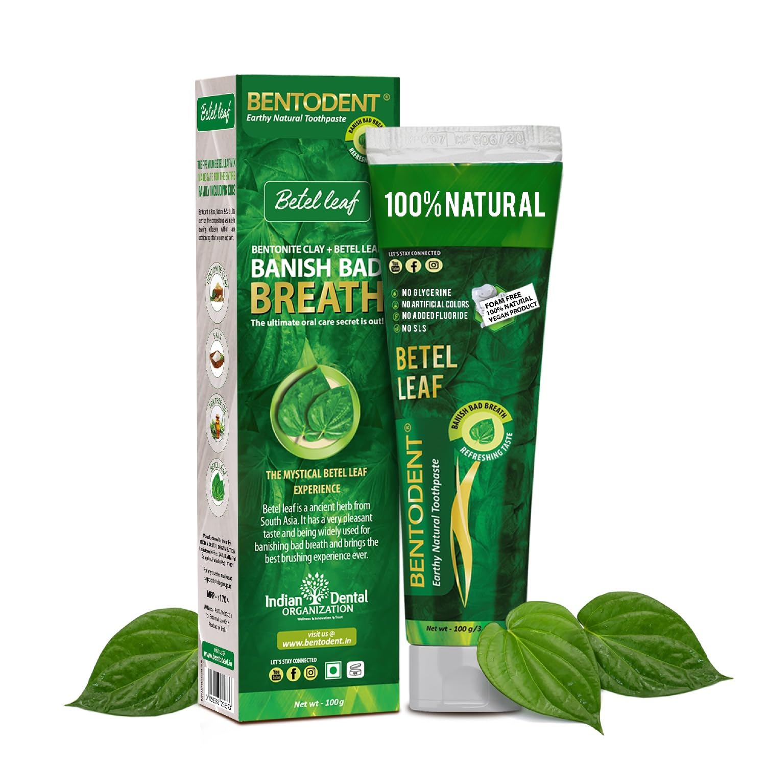Ingredients of Bentodent Organic Sensitive Remineralizing Fluoride free Natural bentodent natural calcium bentonite clay toothpaste: Purified Aqua, Bentonite Earth, Salt, Purified Plant-based Stevia Extract, Tree Tea Oil, Menthol, Natural Glycolipids, Orange Extract, Grapefruit seed extract, Aroma betel leaf. No reaction: Bentodent Organic Sensitive Remineralizing Fluoride free Calcium bentonite clay natural toothpaste, which would not be the cause of any kind of allergic reactions. Major Remineralizing toothpaste contains sodium laurel sulfate as the ingredient which is highly irritating and can cause mouth inflammation or allergies. Using a natural calcium bentonite clay toothpaste is your choice to prevent allergic reactions and protect the health of your mouth. Made Safe Certified Organic Sensitive Remineralizing Fluoride free Natural Calcium Bentonite Clay toothpaste: Confidence in every brush stroke with our Made Safe Certified Remineralizing Calcium Bentonite Clay teeth whitening toothpaste, ensuring it's free from harmful ingredients. Major issue with children while brushing their teeth they will often swallow their toothpaste completely instead of spitting it out which is really not safe. Remineralizing Calcium Bentonite Clay Natural toothpaste like bentodent with all organic composition and without any Sodium laurel sulfate, fluoride-free becomes entirely safe for children. Organic Ingredients inspired by Ayurveda: Our Organic Sensitive Remineralizing Fluoride free Natural toothpaste combines the wisdom of Ayurveda with a 100 natural, vegetarian formula, ensuring a gentle yet effective. Bentodent natural teeth whitening toothpaste is Remineralizing calcium bentonite clay toothpaste which gently cleans your teeth without doing any harm to your teeth enamel. It does not contain any artificial colors and flavors that in general negatively impact the body, so the bentodent Remineralizing natural toothpaste becomes the safest and viable option to use on everyday morning teeth brushing with confidence. WORLD'S FIRST TOOTHPASTE POWERED WITH GOODNESS OF BETEL LEAF GENTLE and SAFE:- Discover the power of nature with Bentodent, the pioneering Organic Remineralizing Fluoride free Natural betel leaf teeth whitening toothpaste, merging the traditional wisdom of Ayurveda with modern oral care. Originating from India, betel leaf is revered in Ayurvedic practices for its positive effects on oral health. Bentodent combines this age-old plant with the purifying qualities of Remineralizing calcium bentonite clay to create a Remineralizing toothpaste that's entirely natural and incredibly effective.