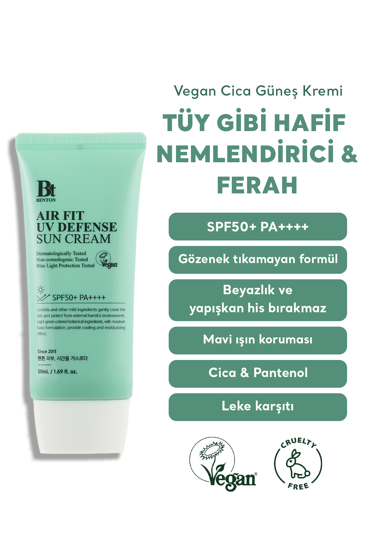 Benton'un çok sevilen günes kremi Air Fit UV Defense Sun Cream, günes kremi kullanmayi 4 mevsim keyfe dönüstürüyor. Bir nemlendirici mi yoksa bir günes kremi mi kullandiginizi çogu zaman karistiracaginiz tüy gibi hafif ve ferahlatici vegan formülüyle Air Fit UV Defense Sun Cream, tüm ciltler için cilt bakimi, günes koruma ve daha fazlasini bir arada sunuyor.