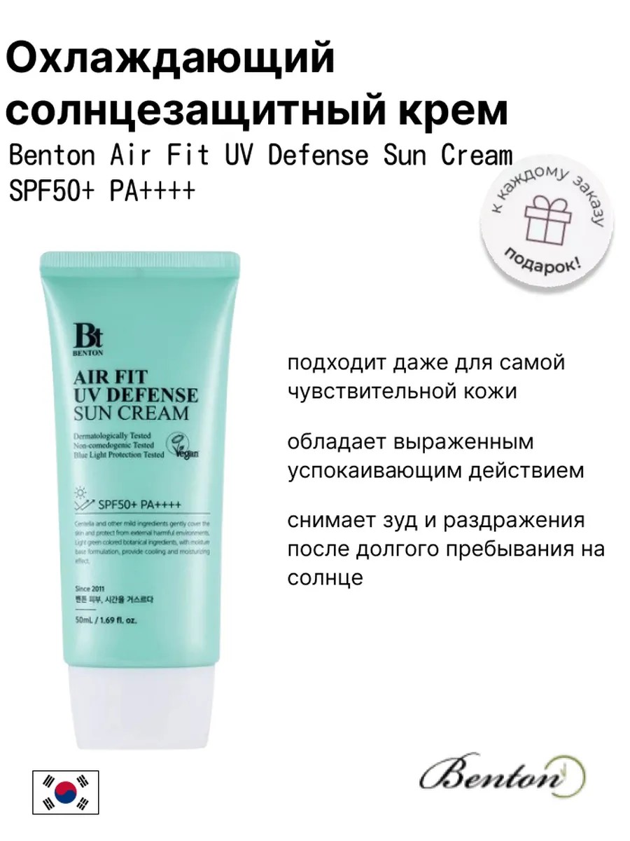 Охлаждающий солнцезащитный крем Benton Air Fit UV Defense Sun Cream SPF50+ PA++++подходит даже для самой чувствительной кожи, обладает успокаивающим действием, снимает зуд и раздражение после долгого пребывания на солнце.