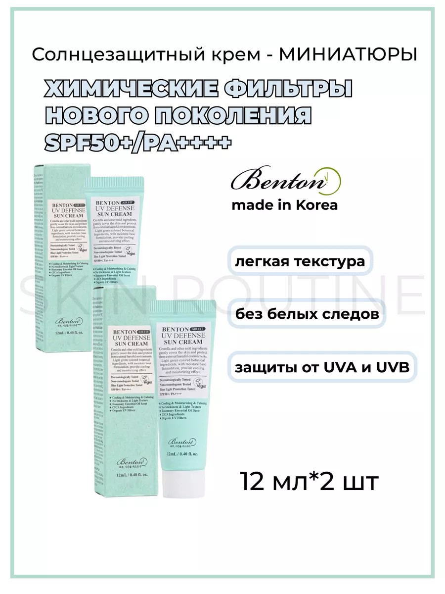 Benton Air Fit UF Defense SUN Cream, a lightweight Korean sunscreen in miniature form, provides maximum protection from UVA and UVB rays. The protection is based on stable, next-generation chemical filters that absorb UV rays, protecting the skin from damage and photoaging. Contains filters: Uvinul A Plus (Diethylamino Hydroxybenzoyl Hexyl Benzoate) - protection from UVA rays; Uvinul T 150 (Ethylhexyl Triazone) and Diethylhexyl Butamido Triazone - protection from UVB rays. This sunscreen prevents the appearance of wrinkles, age spots, post-acne, and dehydration. Benton SPF is suitable for face and body, does not leave marks on clothes, does not turn white, and improves skin tone. It is quickly absorbed due to its light, non-sticky texture. Suitable for all skin types. Centella asiatica extract - restores, heals, suitable for skin with rosacea. Panthenol (vitamin B5) moisturizes, protects, and softens. Tocopherol (vitamin E) provides antioxidant and nourishing properties. This SPF moisturizer has a slightly greenish tint and a rosemary scent. Skincare steps: cleanse (foam cleanser), toner, serum, cream (lotion or emulsion), and then sunscreen. Reapply every 2-4 hours in direct sunlight or after swimming. Apply to ears, hands, and other exposed areas.