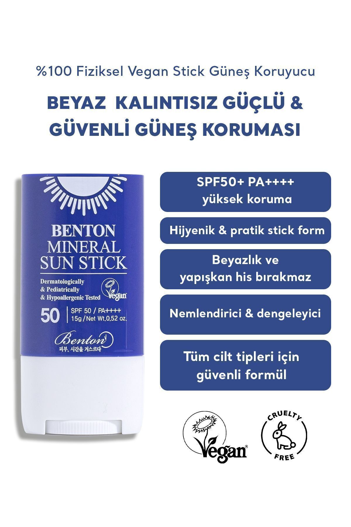 Benton Mineral Sun Stick SPF50 PA , balm tipi yumusak dokusu ile genis spektrumlu ve güçlü günes korumasini yeniden tanimliyor. Benton için günes korumasi tek basina asla yeterli degil! Formülündeki farkli moleküler boyutlara sahip 3 farkli tip Hyalüronik asit ve E vitamini ile cildi nemlendirmek, beslemek ve dengelemek için de ideal! Cildinizi günesin zararli isinlarina karsi 12 saate kadar koruyabilir ve gün içinde ihtiyaç duydukça hijyenik bir sekilde tekrar uygulayabilirsiniz! Yapiskanlik hissi ve beyaz kalinti birakmayan özel formülü hassas ciltler dahil tüm cilt tipleri ve yas gruplari tarafindan, dört mevsim boyunca kullanima uygundur.