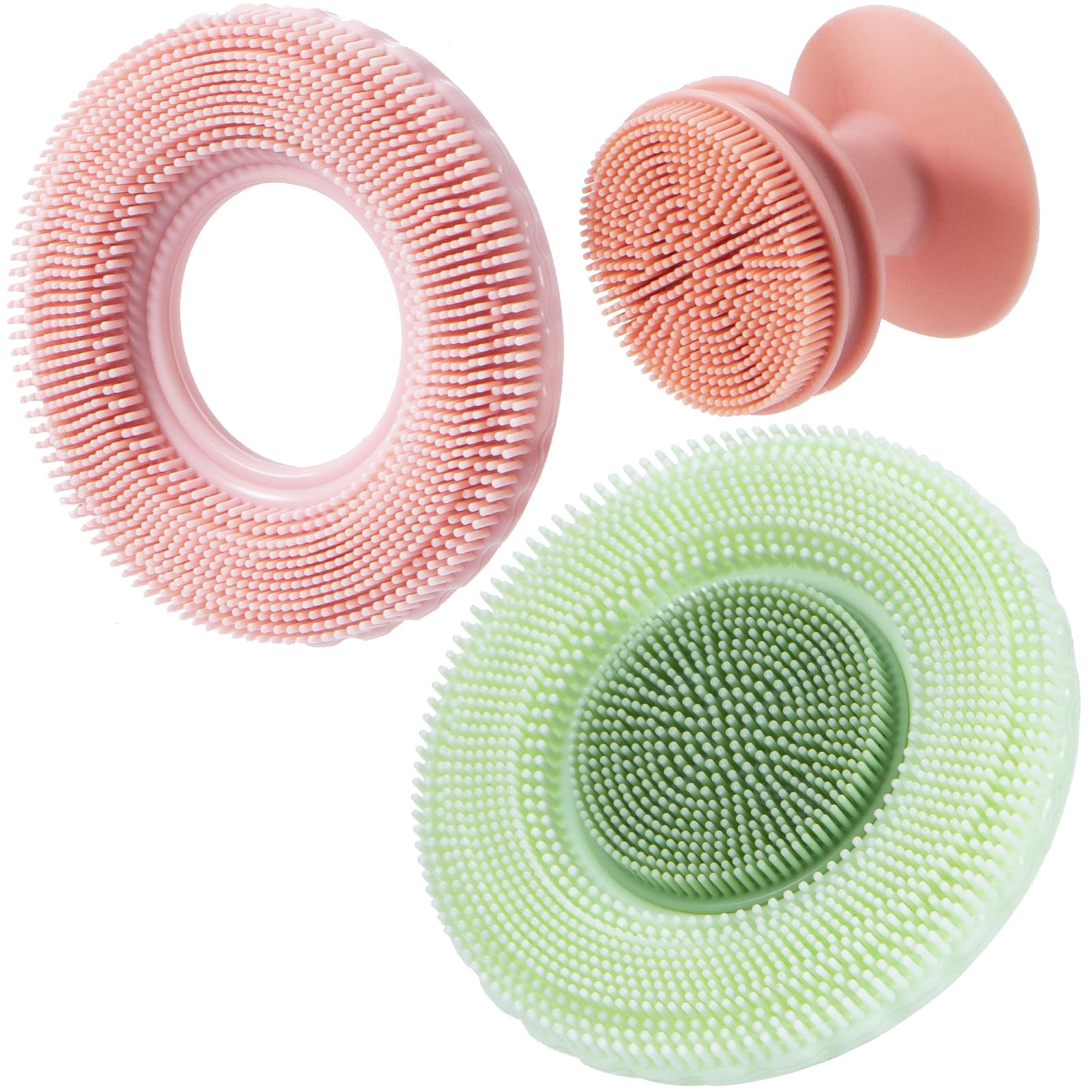 Beomeen Silicone Face Scrubber Exfoliator 2 in 1 Removable Round Manual Facial Cleansing Brush for Deep Cleaning and Massaging Skin Care Face Wash Brush Blackhead Acne Pore Pad (Green+Pink)