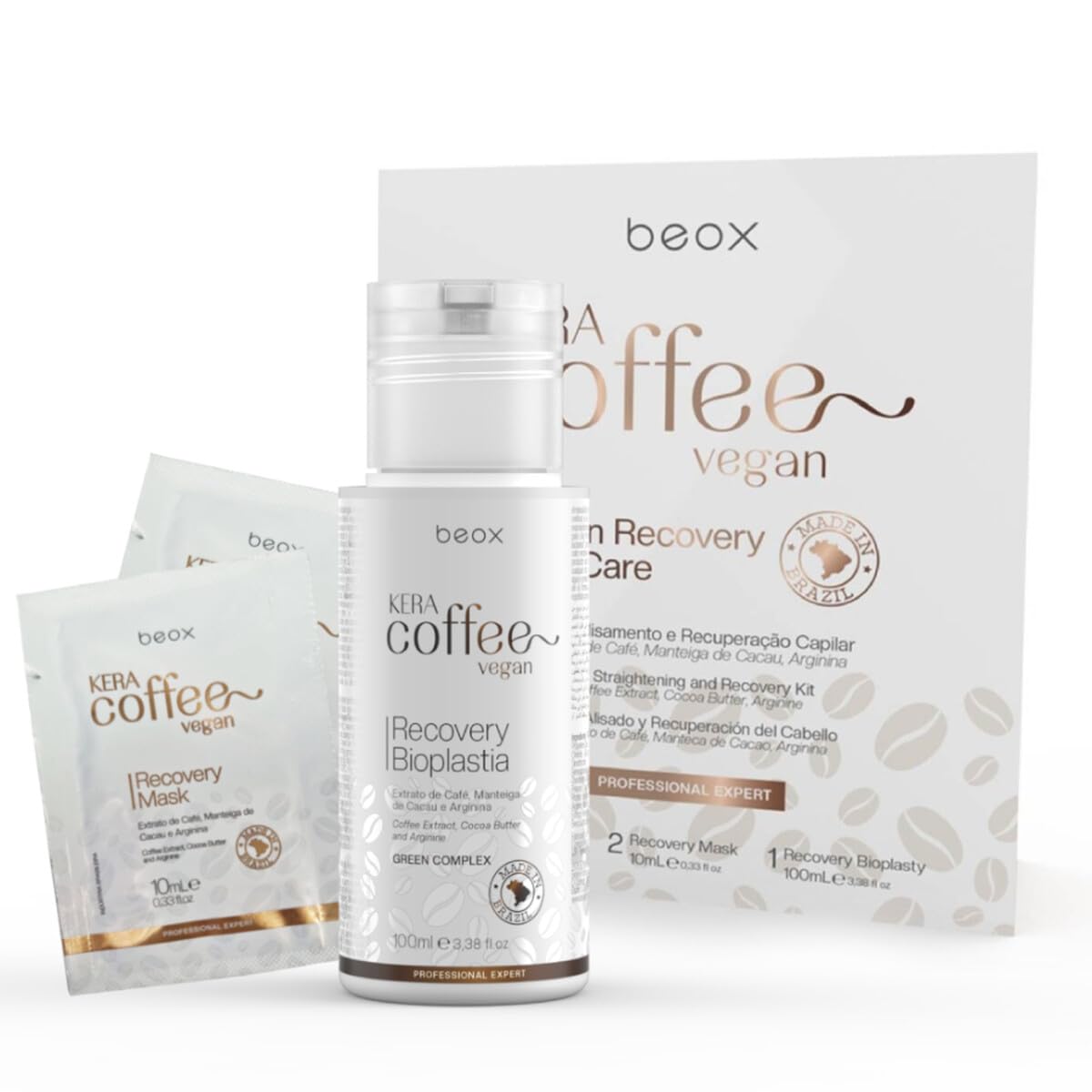 Beox KeraCoffee Hair Straightening Kit 100ml Vegan Line, completely free of formaldehyde and animal-derived substances. Formulated with natural, organic active ingredients. Kit contents: 2 x 10ml Recovery Shampoos, 2 x 10ml Recovery Masks, 1 x 100ml Bioplasty Recovery INSTRUCTIONS FOR USE Apply to wet hair, leave on for 3 to 5 minutes, and rinse. SAFETY WARNING Professional use only. For external use only. Avoid contact with eyes. Keep out of reach of children, away from fire and direct heat sources. See more