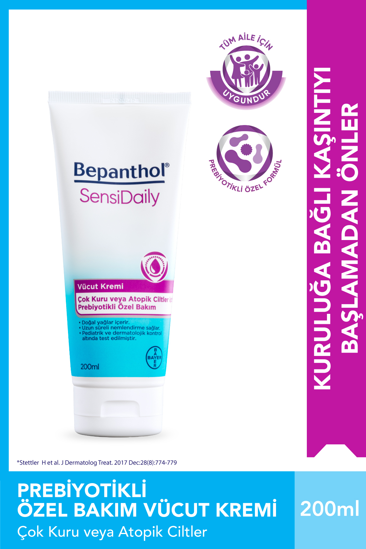 "Bepanthol SensiDaily Vücut Kremi çok kuru veya atopik ciltler için gelistirilmis, bebeklikten itibaren kullanilabilen, prebiyotikli bir günlük vücut kremidir. Düzenli kullanimda, prebiyotikli formülü ile cildin dogal koruyucusu olan mikroflorayi destekler. Tekrarlayan yogun kurulugu ve kasintiyi baslamadan önler. B3 vitamini, Provitamin B5, Sheabutter, Seabuckthorn Yagi, Seramid 3, Gliserin ve Zeytinyagi ile zenginlestirilmis formülü sayesinde uzun süreli bir nemlendirme saglar. Bebeklerde ve çocuklarda kullanimi güvenlidir. Günlük kullanima uygundur. Koruyucu, parfüm, paraben, renklendirici ve SLS içermez."