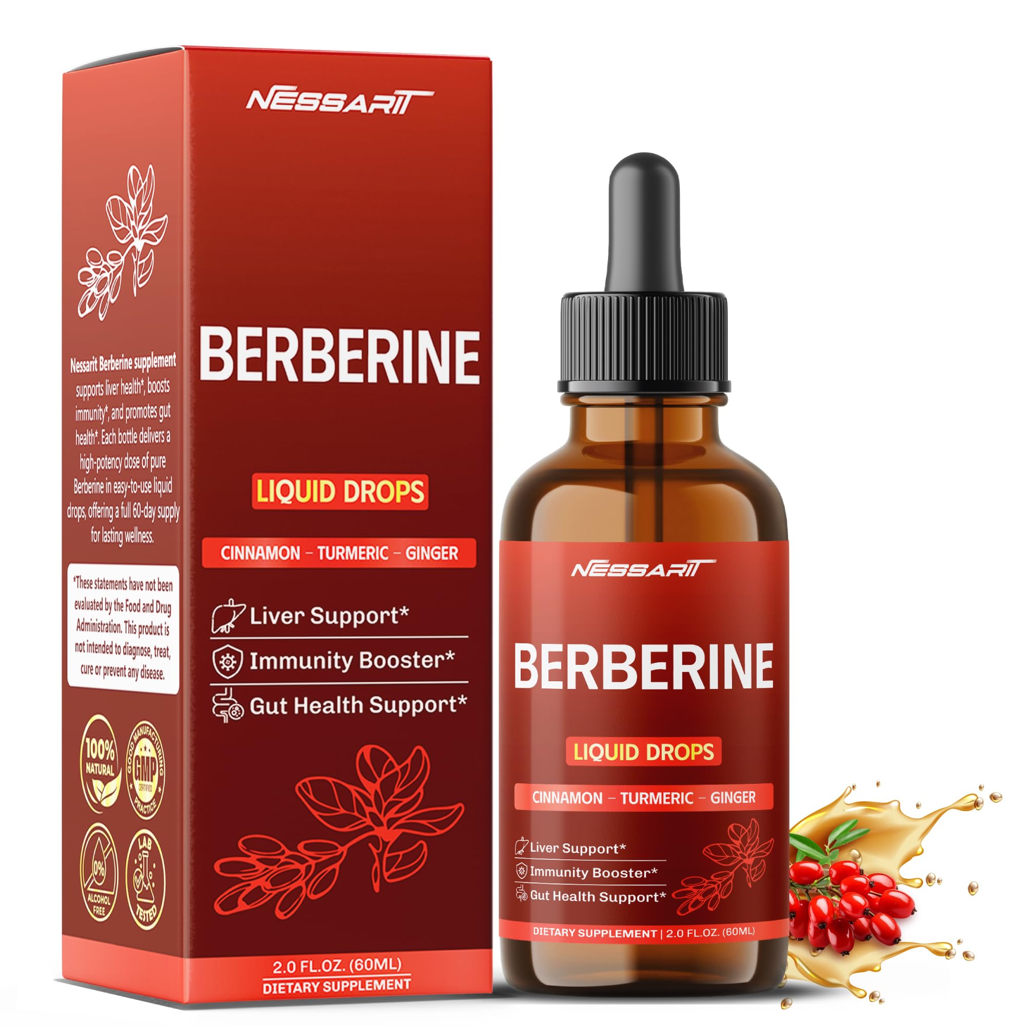 Berberine Liquid Drops Cinnamon Turmeric Ginger - Liver Support Immunity Booster Gut Health Support - 2.0 fl oz (60ml) 2 Fl Oz (Pack of 1)