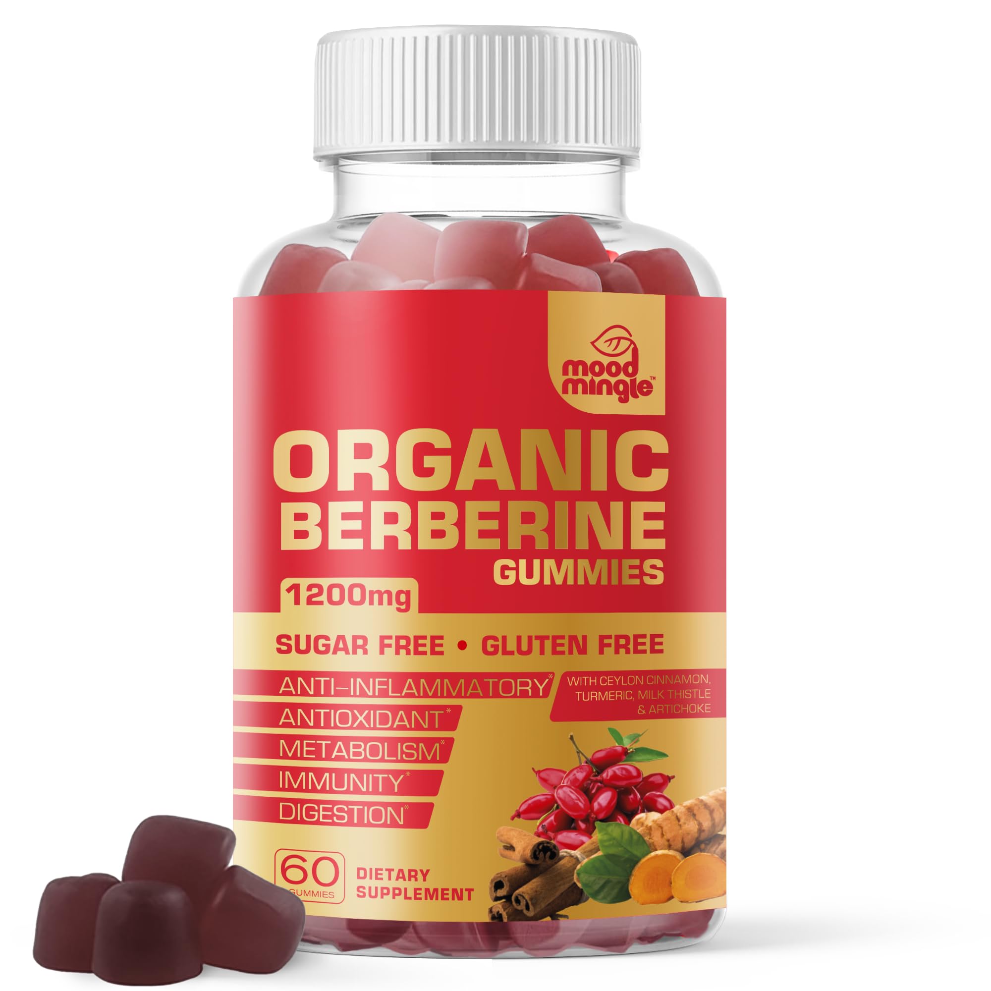 Manufactured in an FDA-Certified Facility GMP-Quality Vegan Friendly Not Tested on Animals Non-GMO Ingredients Enhanced Bioavailability MoodMingle Berberine Gummies use ingredients with high bioavailability for optimal health support. Premium Quality Ingredients Each berberine gummy, carefully crafted with high-quality berberine extract renowned for its potential health benefits, undergoes rigorous testing to ensure purity and safety, providing you a product you can trust. High Potency Gummies MoodMingle Berberine Gummies deliver a potent combination of 1200mg of berberine and 200mg of Ceylon Cinnamon. Sugar-Free and Gluten-Free Our berberine gummies are meticulously crafted to be gluten-free and sugar-free, rendering them a perfect choice for those with diverse sensitivities and requirements. Essential Nutrients Berberine, Ceylon Cinnamon, Turmeric, Milk Thistle, Artichoke Safety Assurance. This product does NOT contain these ingredients that may cause allergic reactions in some individuals: Gluten, Wheat, Yeast, Milk, Lactose, Soy, Fish, Nuts, Artificial Flavors, Artificial Colors, Artificial Sweeteners. Suggested Use: Adults should take two (2) gummies daily, preferably before a meal, or as directed by a healthcare professional. For adult use only, not formulated for use by children.Sugar Free, Gluten Free: MoodMingle Berberine Gummies provide tasty flavor blends with no added sugar or gluten, offering a delightful way to include berberine in your diet while adhering to dietary restrictions and opting for a healthier choice. Supports General Wellness: MoodMingle Berberine Gummies, formulated specifically for enhancing general wellness and maintaining optimal energy levels throughout the day, also aid in supporting overall health, balance, and well-being. High Quality Ingredients: Each gummy is carefully crafted in an FDA registered facility, following strict GMP Quality standards, and using only the highest quality berberine for purity and potency, ensuring that each gummy provides optimal nutritional benefits. High Potency Gummies: Maximize the benefits of MoodMingle Berberine Gummies with each serving delivering a potent combination of 1200mg of berberine and 200mg of Ceylon Cinnamon for optimal effectiveness in efficiently supporting bodily functions. 5-in-1 Formula, Powerful Combination: The combination of berberine, Ceylon cinnamon, turmeric, milk thistle, and artichoke create a powerful mixture of natural ingredients renowned for their diverse health benefits.