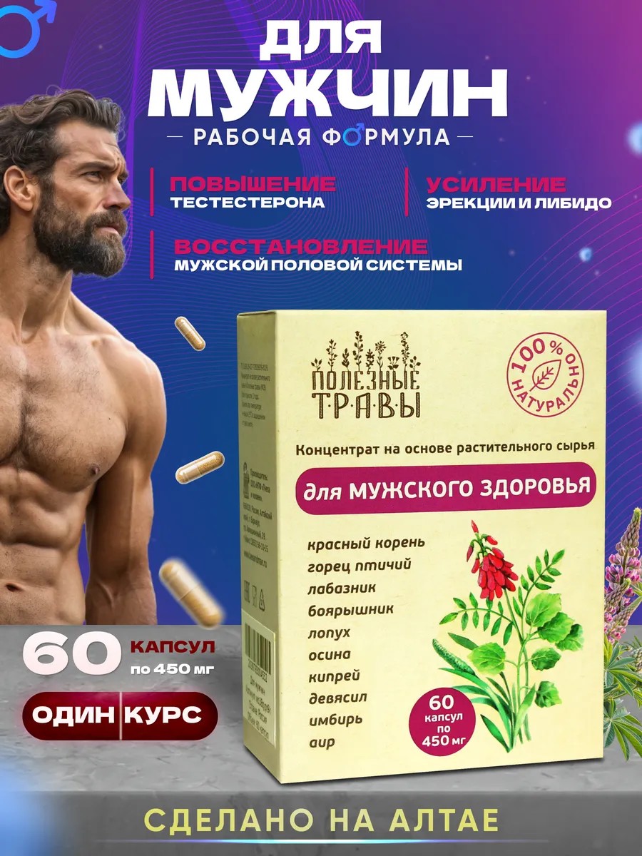 Представляем травяной фитокомплекс для мужского здоровья и лечения простаты. Он разработан специально для восстановления работы нервной и гормональной системы. Комплекс в капсулах улучшает репродуктивные функции органов и участвует в повышении либидо. Концентрат состоит из сбора чистых алтайских трав. В составе красный корень и лопух, обладающие кровоостанавливающим и противовоспалительным действием. Кора осины обладает мочегонным и обезболивающим свойством. Боярышник борется с неврологическими заболеваниями и снимает отеки. Девясил, горец птичий и аир оказывают антисептическое воздействие. Препарат идет в таблетках, которые необходимо принимать три раза в день во время еды. Средство поспособствует нормализации уровня тестостерона у мужчины, поможет в терапии простатита и избавлении от проблем с потенцией. Выбирайте качественный и безопасный товар. Заказывайте полезную пищевую добавку сейчас и сделайте свою жизнь лучше уже завтра!