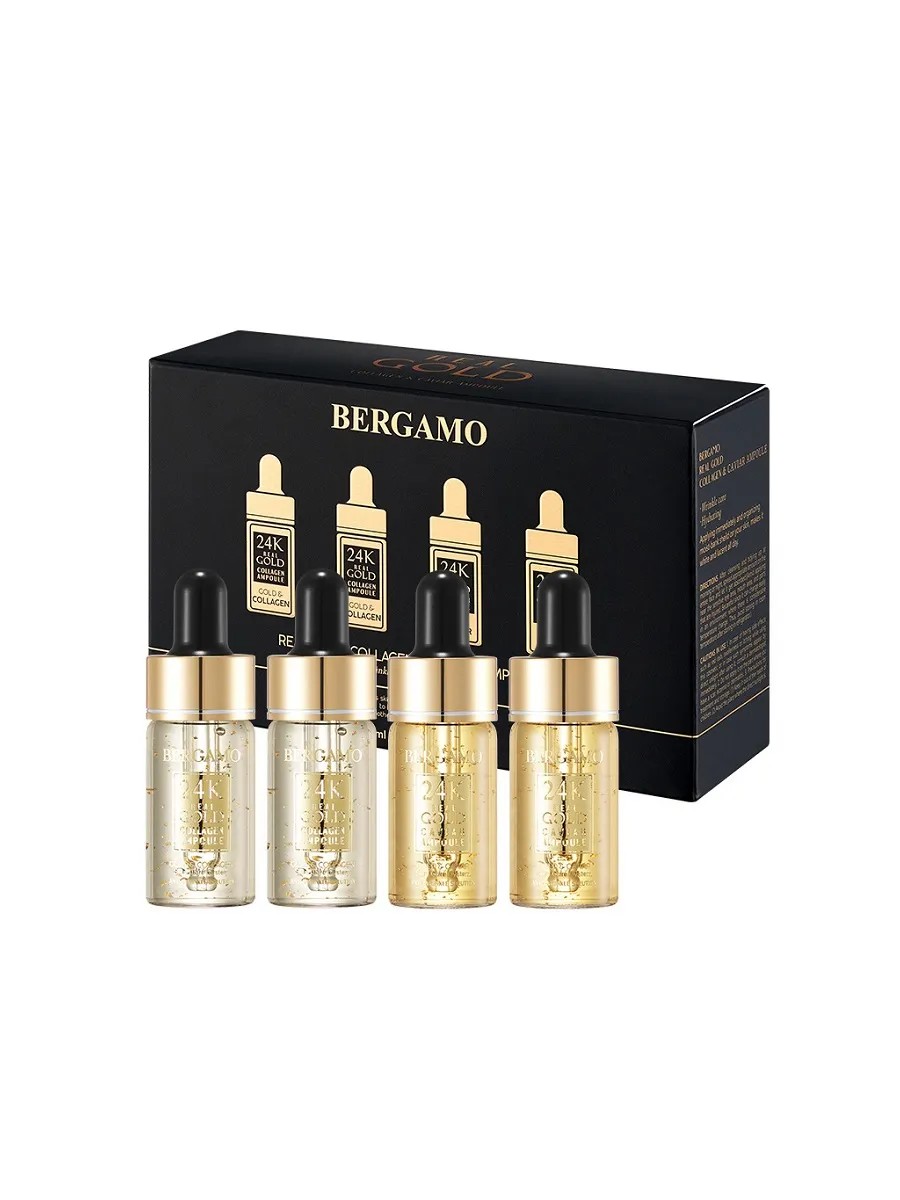 A set of anti-aging ampoule serums with caviar extract and gold (4 pcs) Real Gold Collagen & Caviar Ampoule from the Korean brand Bergamo is designed for intensive skin restoration.