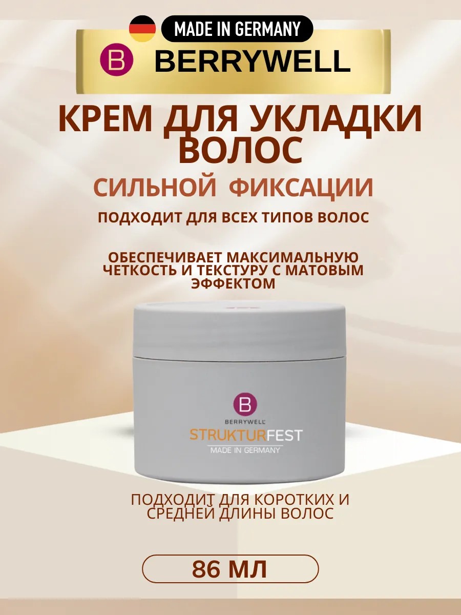 Berrywell STRUKTURFEST Strong Hold Styling Cream. Berrywell STRUKTURFEST Strong Hold Styling Cream offers reliable control and professional styling. Berrywell STRUKTURFEST professional styling paste provides reliable and strong hold without weighing down or leaving strands looking stuck together. This product is ideal for creating defined, structured looks, adding definition, texture, and a matte finish. The formula is specially designed for short and medium-length hair. The paste allows for styling throughout the day and maintains its shape even in high humidity and during active lifestyles. It leaves no greasy shine, spreads easily, and rinses out easily without leaving a residue. Berrywell STRUKTURFEST is the choice of professional stylists who value precision, hold, and versatility in styling. Directions: Warm a small amount of paste in your palms and apply evenly to dry or slightly damp hair. Shape your desired style with your fingers or a comb. Benefits: Strong hold without weighing hair down. Matte finish and bold texture. Suitable for creative and everyday styling. Doesn't stick hair together or leave residue. Ideal for short to medium-length hair. Humidity-resistant and easy to rinse. Best for: Professional hairdressers and barbers for creative haircuts and men's styles. Men and women who prefer precise shapes and long-lasting styles. People with short to medium-length hair who want to maintain their style all day long. Those looking for a versatile product for everyday use.