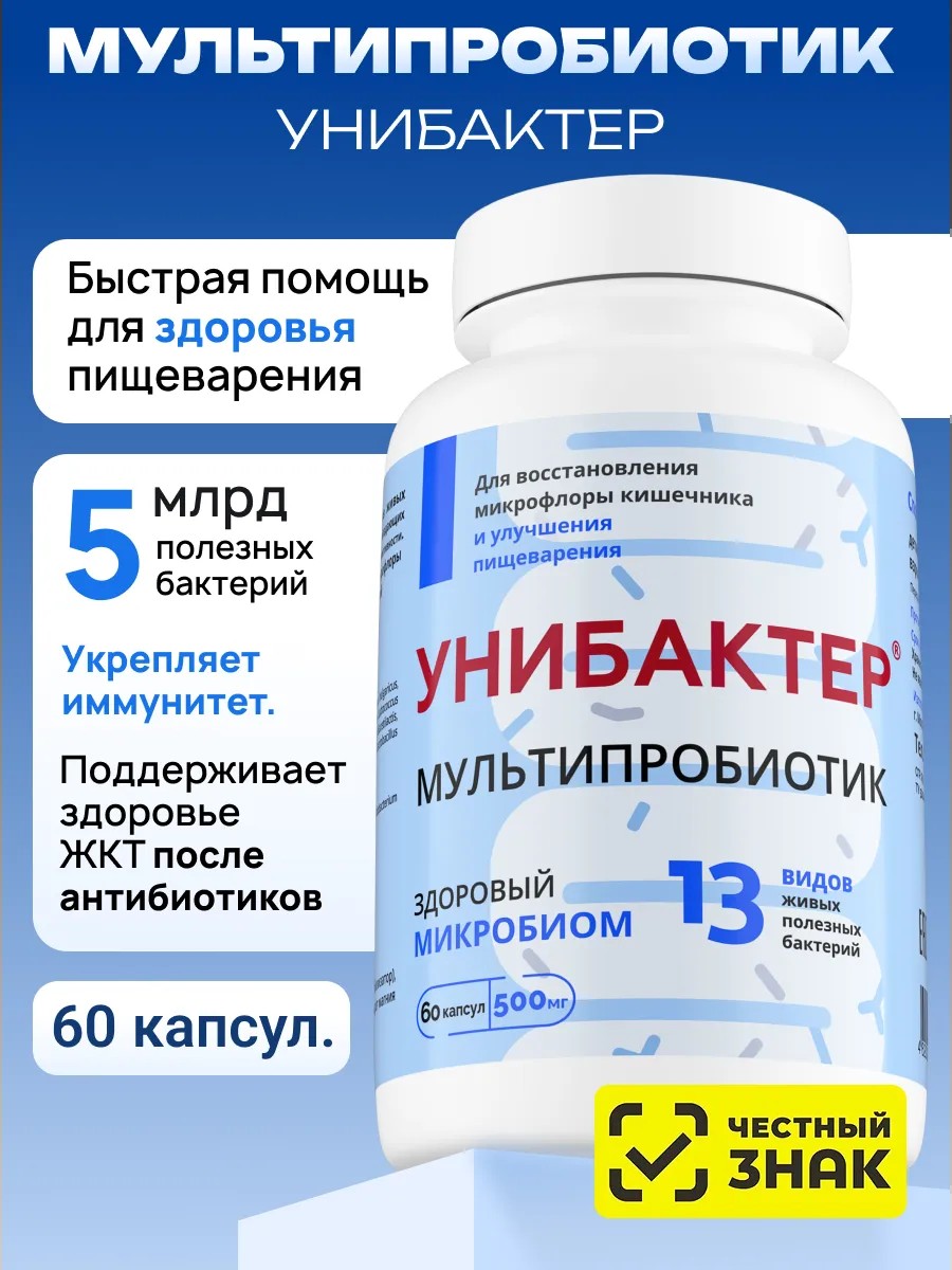 Синбиотик - это сочетание полезных пробиотиков и компонентов, питающих эти бактерии (пребиотиков). Вместе они помогают восстанавливать естественный баланс микрофлоры кишечника и способствуют ее здоровому функционированию. Унибактер является одновременно и пробиотиком и пребиотиком для кишечника взрослому. Наш синбиотик очень богат составом и содержит: