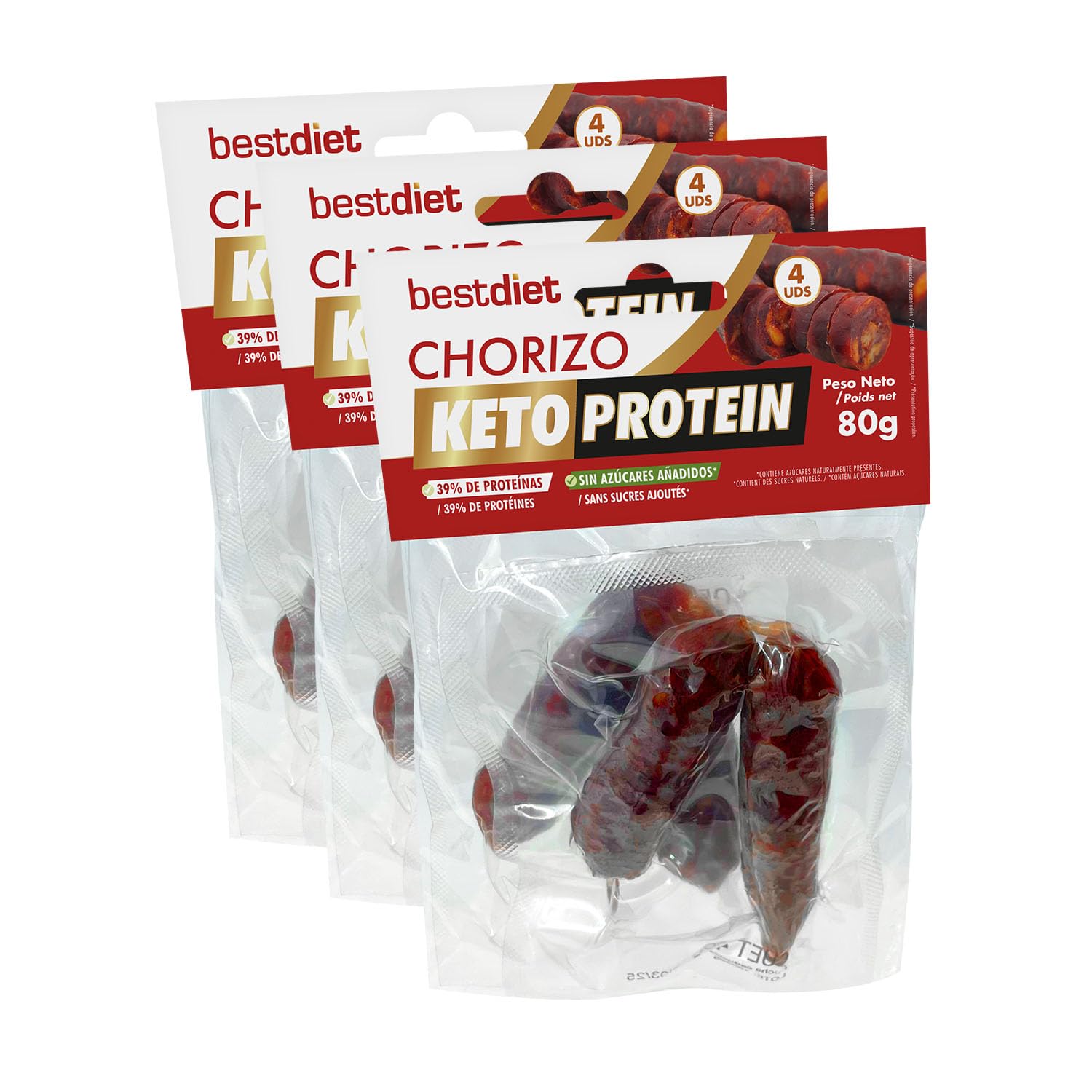 Bestdiet Keto Protein Bestdiet - Bâton chorizo faible en gras - Friandises protéinées - Lot de 12 unités (3 paquets) de 80 g