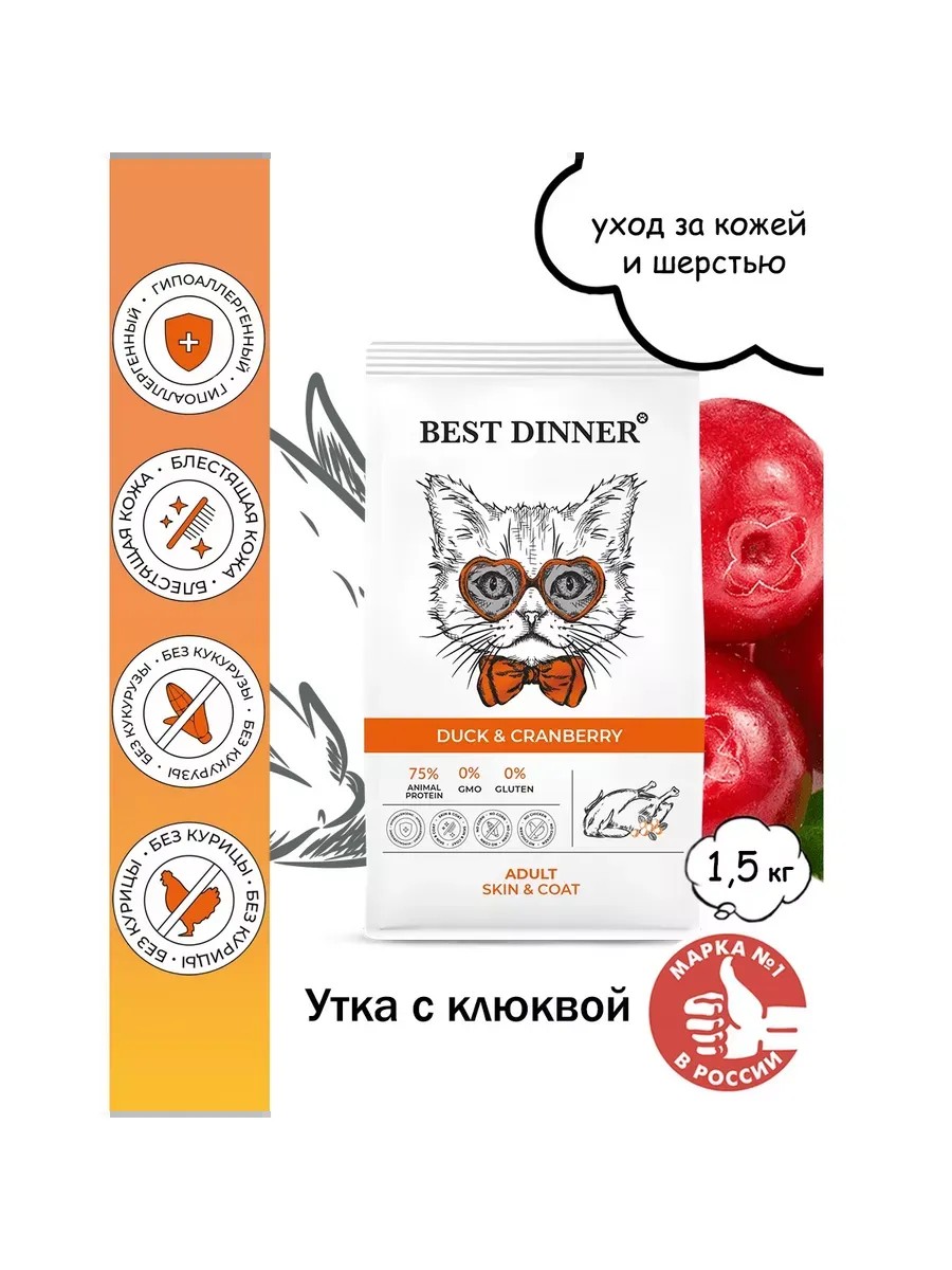 КомплектацияСухой корм Best Dinner для кошек Duck and Cranberry с уткой и клюквой для здоровья кожи и шерсти