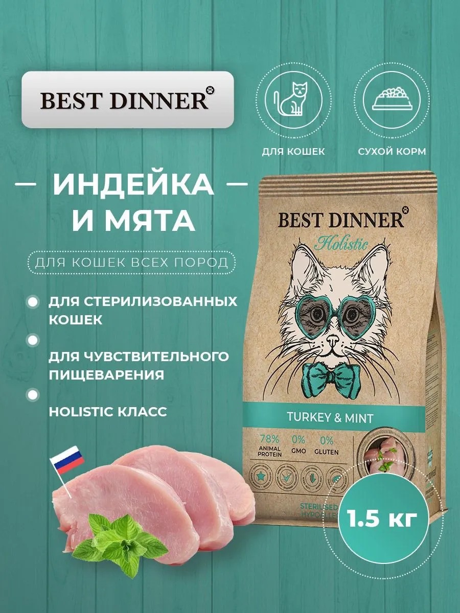 Сухой корм Best Dinner Holistic Hypoallergenic Adult Sterilised TURKEY&MINT гипоаллергенный, для стерилизованных кошек склонных к аллергии и проблемам с пищеварением, с индейкой и мятой 1.5 кг