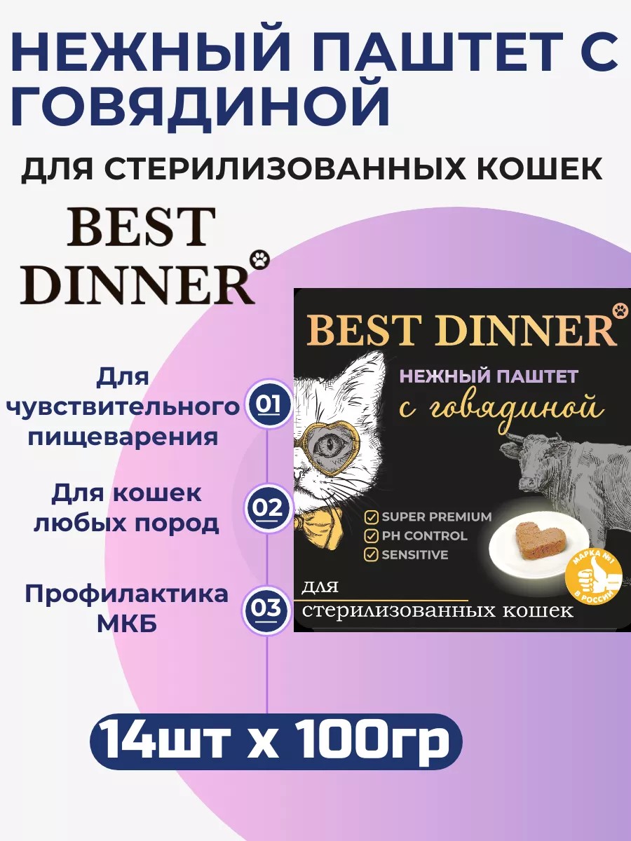 | Комплектация | Влажный корм Best Dinner, нежный паштет для стерилизованных кошек с говядиной |