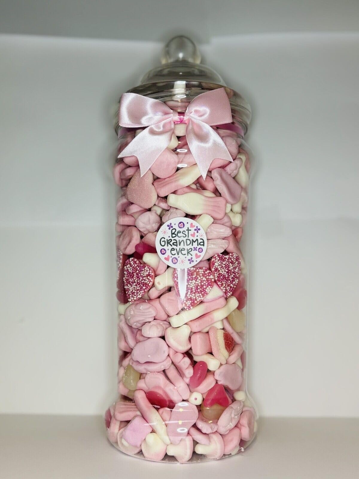 These make the perfect Birthday or Mothers Day gift. Best Grandma. All pink or white in colour. A large 2.5l jar filled with pick n mix sweets.