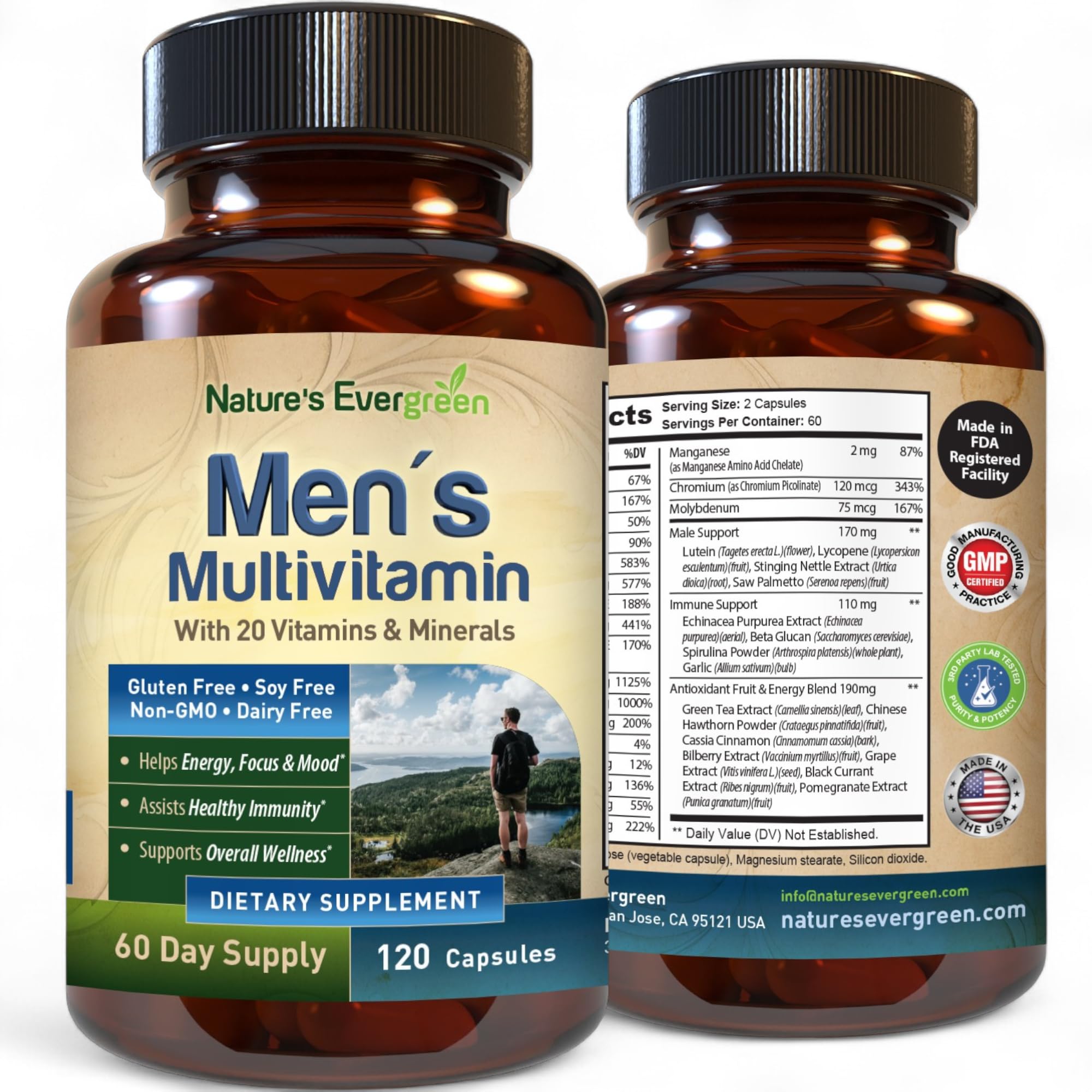 90-DAY MONEY-BACK GUARANTEE: We stand behind every product we make. For any reason, you're not completely satisfied within 90 days, simply reach out to us, and we'll do our best to resolve the issue. Try Nature's Evergreen products with 90-day risk-free guarantee!. PREMIUM QUALITY TRUSTED FORMULA: Proudly made in the USA, non-GMO vegetarian, gluten free, sugar free and dairy free. This Multivitamin supplement is manufactered in GMP certified facilities in the United States, each batch is third party lab tested to ensure the highest standards of purity potency, and safe ingredients that you can use with confidence. 60 DAY SUPPLY: Each bottle provides a two-month supply to ensure optimal freshness and consistent immune support. Formulated to meet the unique health needs of men, this multivitamin provides essential nutrients for energy, heart, brain, bone, and immune health. It also promotes healthy digestion, stress relief, prostate support, and nourishes hair, skin, and nails for overall wellness. DAILY MULTIVITAMIN BENEFITS: This Men's Multivitamin is expertly crafted with magnesium and essential B vitamins, including B1, B2, B6, and B12, to support mental clarity and overall wellness. This formula is designed to enhance focus and energy, helping you approach each day with confidence and clarity. NATURAL MULTIVITAMIN MULTIMINERAL: Our Men's multivitamin supplement is a comprehensive blend of 20 essential vitamins, minerals, and nutrients designed to support overall health and well-being. It features zinc to promote prostate health, vitamin D to maintain strong bones, and a variety of B vitamins to help balance energy levels and reduce stress.