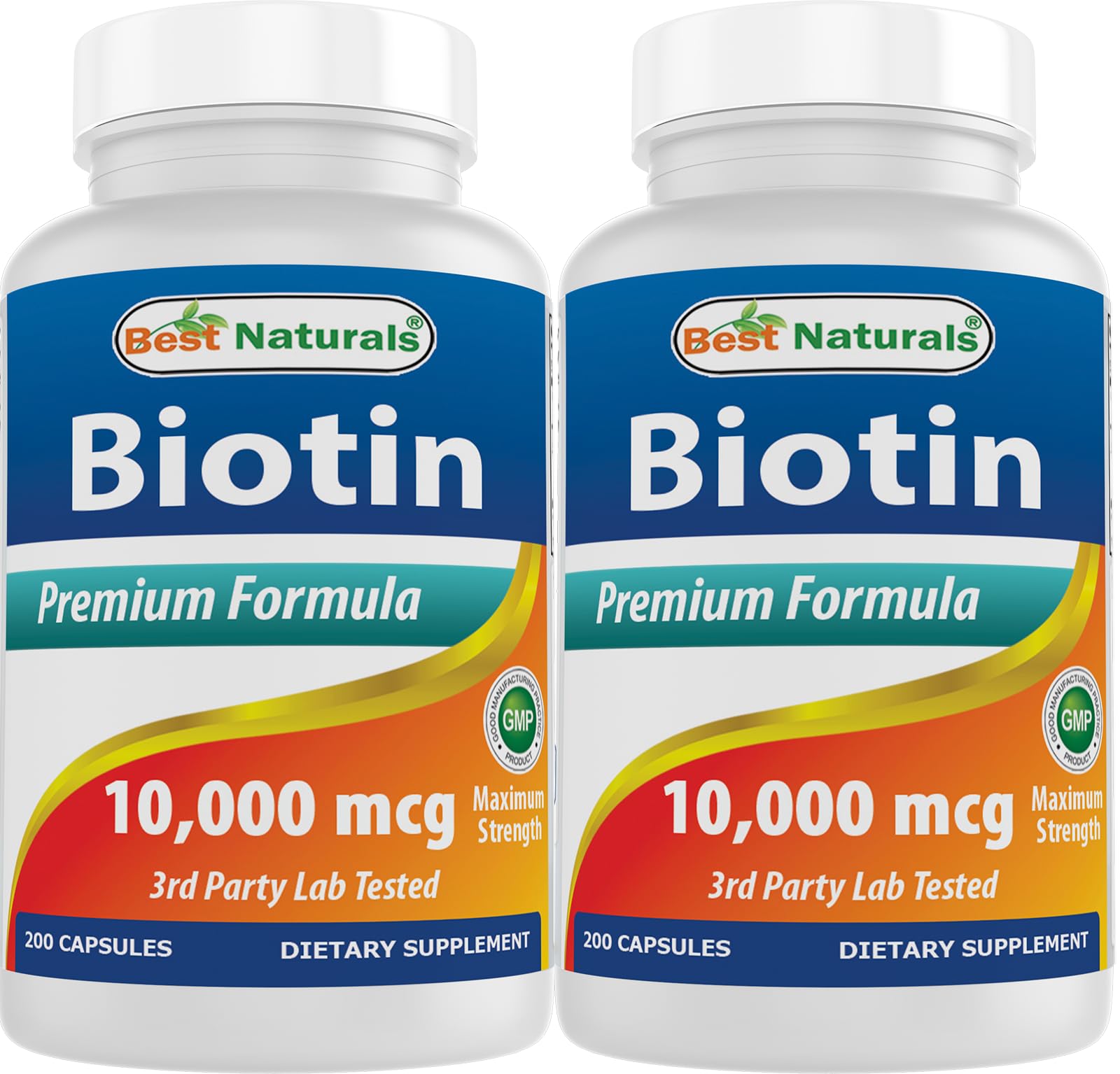 Proudly made in the USA in a GMP-compliant, FDA-registered facility and third-party lab tested for quality. Non-GMO, gluten free, and free from soy, dairy, eggs, wheat, yeast, fish, corn, lactose, and sodium. Made without artificial colors, flavors, sweeteners, or preservatives. Serving size: 1 capsule per serving. Pack includes two bottles, each with 200 capsules of Biotin (10,000 mcg per capsule).