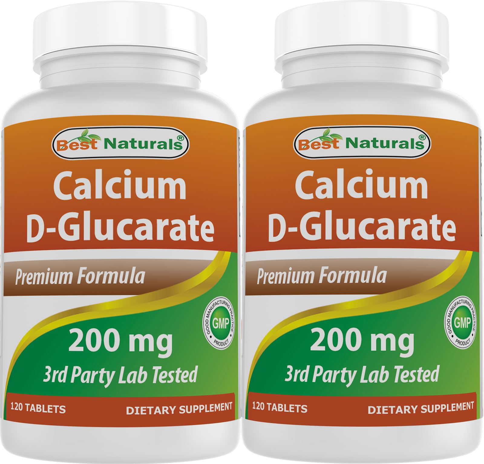 Best Naturals Calcium D-Glucarate provides 200 mg per tablet, with a serving size of two tablets. Each bottle contains 120 tablets, and this listing includes two bottles for a total of 240 tablets. The product is made with quality ingredients and contains no artificial colors, flavors, or preservatives. Tablets are packaged for convenient daily use according to the serving size indicated.