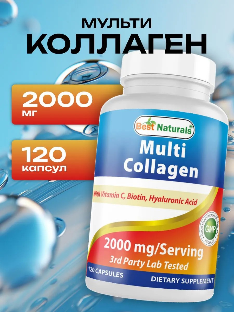 Best Naturals Multi Collagen Pills 2000 мг — это высококачественная добавка, содержащая мультиколлагеновый комплекс с типами I, II, III и VX, которая будет полезна как для женщин, так и для мужчин. Этот продукт направлен на поддержание здоровья кожи, волос и ногтей, а также улучшение состояния сосудов и укрепление иммунитета. В состав входят только натуральные ингредиенты, что делает его безопасным и питательным выбором для ежедневного употребления.