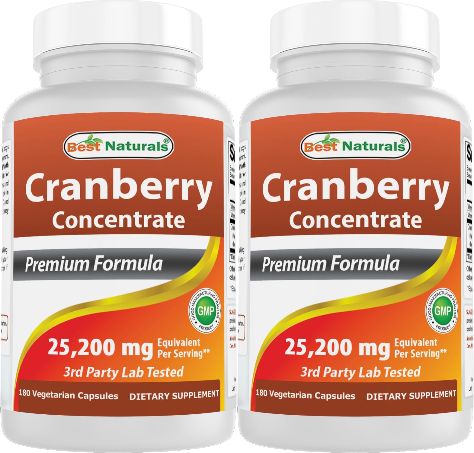 Suitable for individuals seeking a plant-based supplement option. Free from artificial flavors, sweeteners, and preservatives Made in the USA. Pack of 2 for long-lasting use. 180 vegetarian capsules per bottle two-capsule serving size. Provides 25,200 mg cranberry concentrate equivalent per servings (2 capsules).
